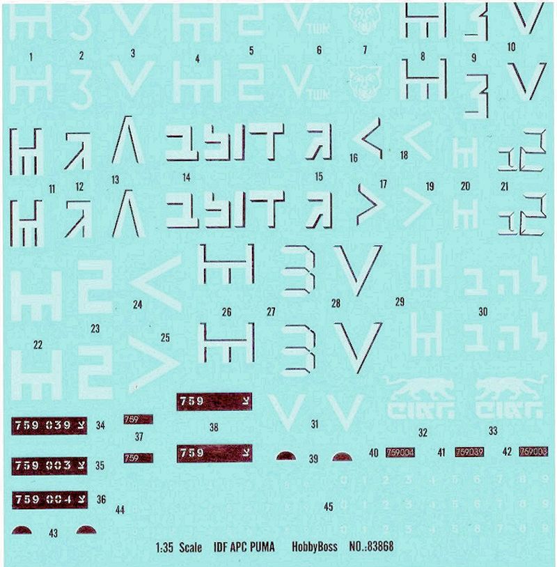 Bemalungsvarianten: Der große Abziehbilderbogen enthält Markierungen für elf verschiedene Fahrzeuge der israelischen Armee. Der farbige Bemalungshinweis zeigt ein Fahrzeug im einfarbigen israelischen dunklen Sinai Grey.