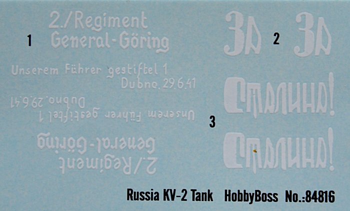Dem Bausatz liegen Abziehbilder zur Gestaltung von 3 KW-1 bei. Ein erbeutetes Fahrzeug mit deutscher Aufschrift, ein sowjetisches mit kyrillischem Schriftzug "Für Stalin" und ein unmarkiertes Exemplar. Die Fahrzeuge sind auf einem farbigen Beiblatt dargestellt.
