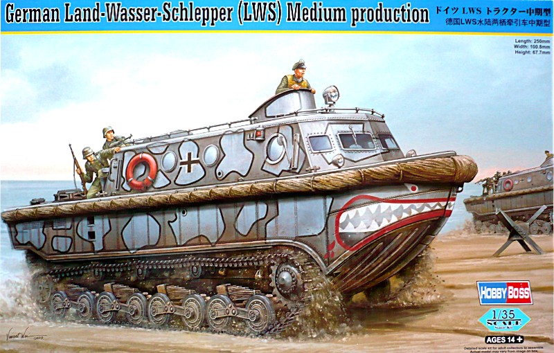 Vorbild: Den Land-Wasser-Schlepper (LWS) darf man als Vorläufer der heutigen Amphibischen Transportfahrzeuge betrachten. Vom LWS wurden kurz vor und zu Anfang des Krieges in Boizenburg / Elbe 21 Stück gebaut. 2 Fahrzeugeinheiten entstanden währen der ersten Kriegsjahre bei Magirus in Ulm. Wichtigste Daten: Maybach V12 Motor HL 108 TR oder HL 120 TRM, 4 Gang- Getriebe, Gesamtmaße 9200 X 3160 X 3130 mm, Gefechtsgewicht 16000 kg. Geschwindigkeit auf dem Land 35, im Wasser 12,5 km/h. Land-Wasser-Schlepper befanden sich auf vielen Kriegsschauplätzen im Einsatz, doch blieben sie nahezu unbekannt. Sie hatten zur Bewährung kaum Gelegenheit, weil es keine Landungsunternehmen größeren Stils gab. Quelle: Kraftfahrzeuge und Panzer der Reichswehr, Wehrmacht und Bundeswehr (Werner Oswald) Motorbuchverlag