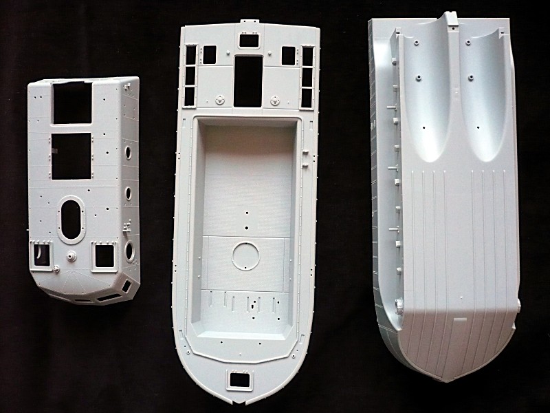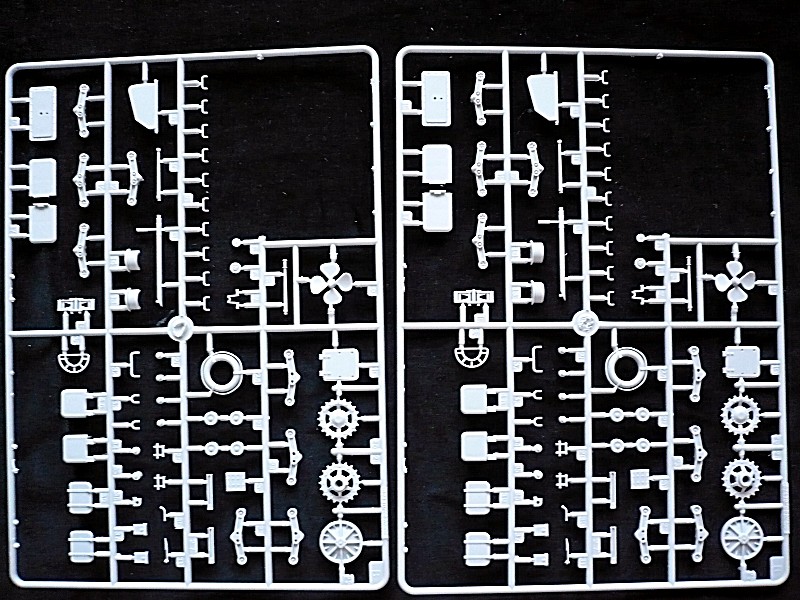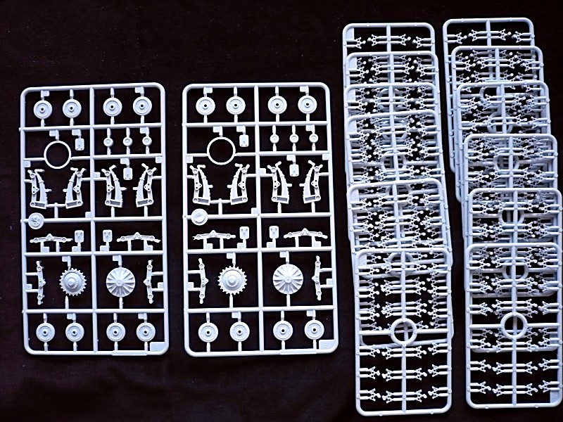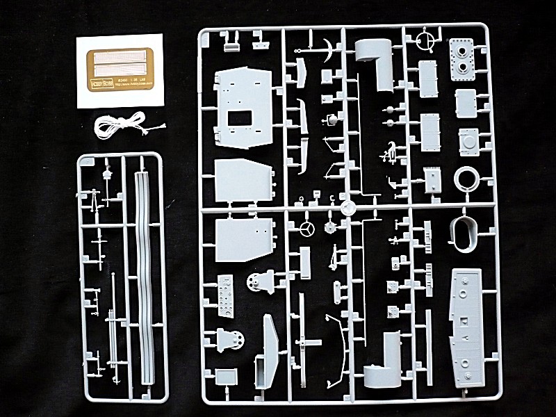 Im Gegensatz zu einer Vinylkette liegen jetzt Einzelkettenglieder in Top-Qualität dem Baussatz bei. Durch eine neuartige wellenförmig gestaltete Montagehilfe lassen sich wunderbar ohne großen Aufwand durchhängende Ketten herstellen. Der Baussatz besteht aus 18 hellgrauen Spritzrahmen, den 3 Hauptkomponenten Wanne, Wannendeck und Aufbau, 1 kleiner Rahmen mit Klarsichteilen, 1 Ätzteilbogen mit den Lüftergittern, 1 Schnur und einem Abziehbilderbogen.