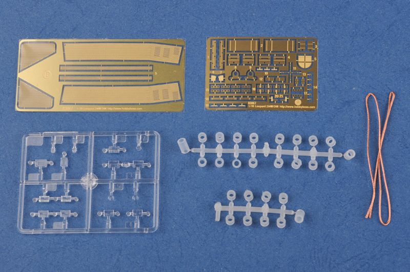 Heute ist es schon beinahe Standard Kettenfahrzeugen eine Einzelgliederkette bei zulegen. Deren Teile befinden sich an 22 schwarzen Spritzlingen. Für die Beweglichkeit der Laufrollen sorgen Polycaps. Wannenunterteil und Oberteil liegen dem Bausatz separat verpackt den Bausatz bei. Dies gilt auch für die Turmteile. Dem Bausatz liegen zwei Ätzteilplatinnen bei. Mit diesen sinnvollen Ätzteilen können z.B. die Gitterumrandung der Turmkörbe detaillierter dargestellt werden. Viele andere Hersteller von Modellbausätzen gegen ihren Panzerfahrzeugen zur Darstellung der Stahlabschleppseile ein Stück Schnur bei. HB geht hier einen anderen Weg und benutzt gedrehte Kupferlitze. Die nachgebildete Gitterpanzerung ist sehr gut wiedergegeben worden. Dünneres Material wird formtechnisch hier nicht mehr möglich sein.