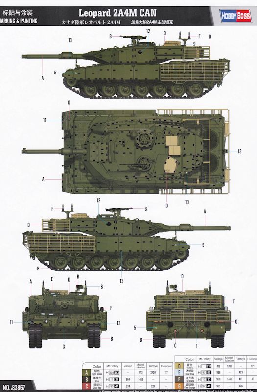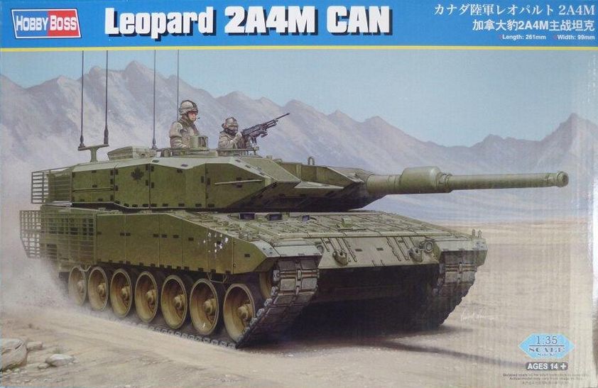 Bausatz: Hobby Boss (China) erweitert mit den Leopard 2A4M CAN seine Palette moderner Gefechtsfahrzeuge im Maßstab 1:35. Obwohl Hobby Boss schon einige Leopard 2 verschiedener Varianten im Programm hat, steigerte er bei diesem Bausatz nochmal die Qualität. Im HB typischen stabilen Karton mit attraktivem Deckelbild befinden sich neun dunkelgrüne Spritzlinge, ein Gußast aus Klarsichtmaterial für die Nachbildung der Winkelspiegel und Hauptscheinwerfer.