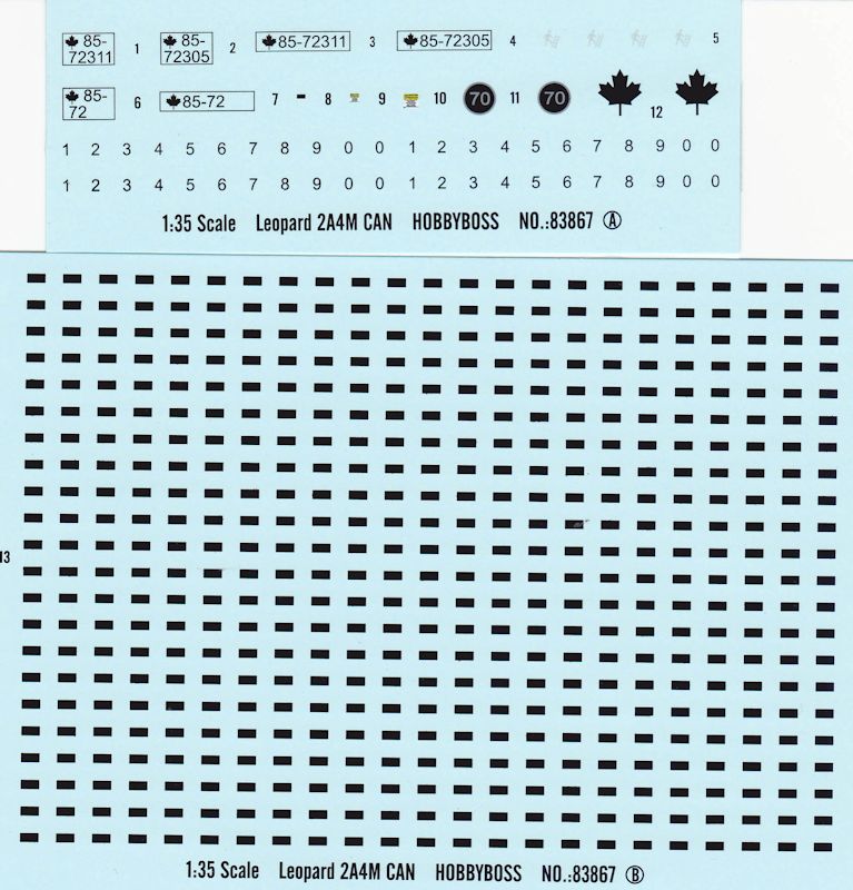 Bemalungsvarianten: Hobby Boss gibt fünf Farbhersteller an: Mr.Hobby, Vallejo, Model Master, Tamiya und Humbrol. Die Platzierung der Decals ist auf einem Din A4 farbigen Painting und Marking Guide verzeichnet. Die Decals sind auf zwei Bögen verteilt. Gerade die Anbringung der Festhaltepunkte der Barracuda Tarnung erfordert Sorgfalt und Geduld. Die Decals sind glänzend gedruckt. Hobby Boss gibt leider keine Anhaltspunkte zur Zugehörigkeit des Fahrzeuges innerhalb der kanadischen Armee.