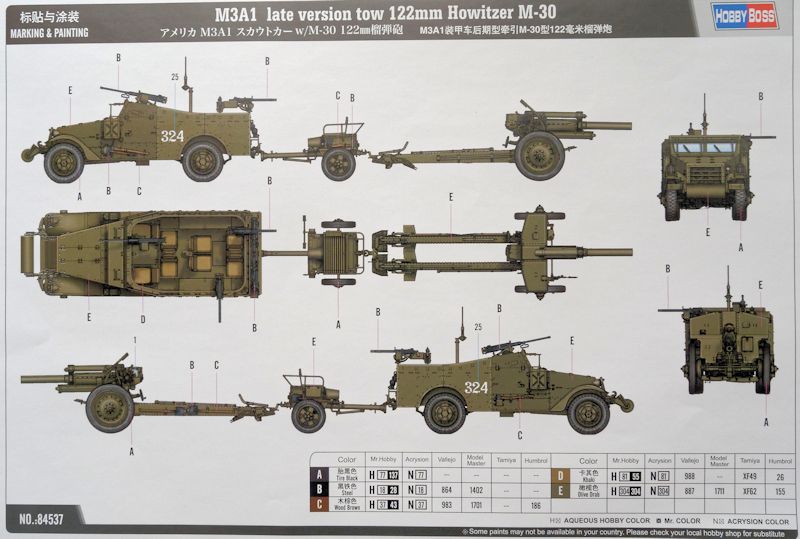 Bausatz: Der Karton enthält somit zwei vollwertige Bausätze, den hauseigenen Scout Car und die von Trumpeter übernommene Haubitze. Der sehr stabile Stülpkarton mit seinem etwas langweilig gestalteten Titelbild lässt erst einmal nichts Herausragendes erwarten. Hat man ihn jedoch geöffnet wandelt sich dieser Eindruck sofort ins Gegenteil. Mit großer Sorgfalt, einzeln verpackter, Spritzlinge, die teilweise auch noch zusätzlich mit Schaumfolie gesichert sind, befinden sich hier im Inneren. Die Spritzlinge sind nicht nur mit einem Einleger voneinander getrennt, sondern sogar in verschiedenen Farben gegossen: Die Teile für den M3A1 sandfarben und die Kanonenteile mausgrau. Für beide Bausätze findet man sogar zwei einzelne s/w Bauanleitungen in Heftform sowie eine separate Bemalungstafel in Farbe gedruckt.