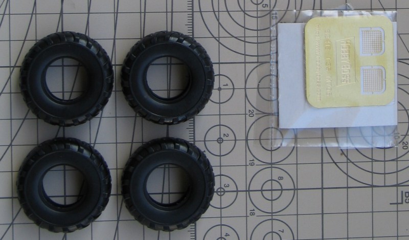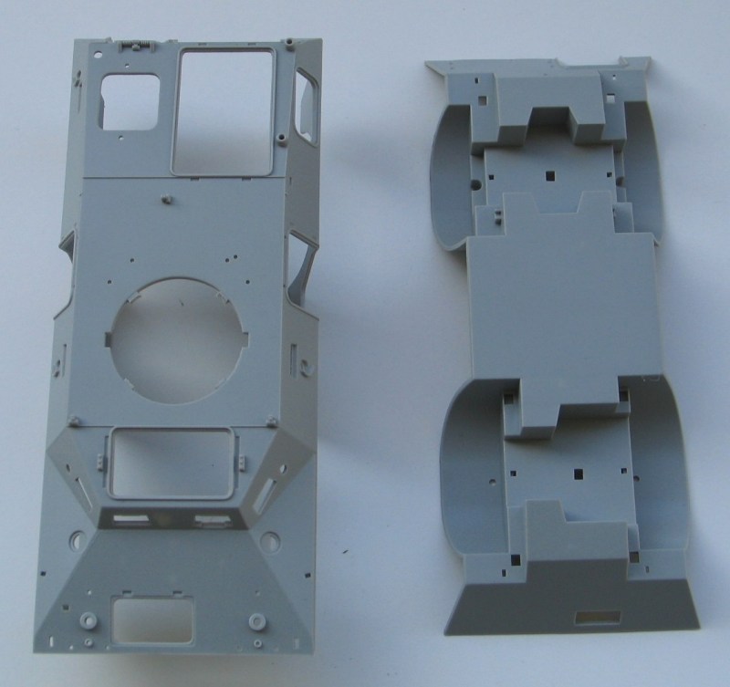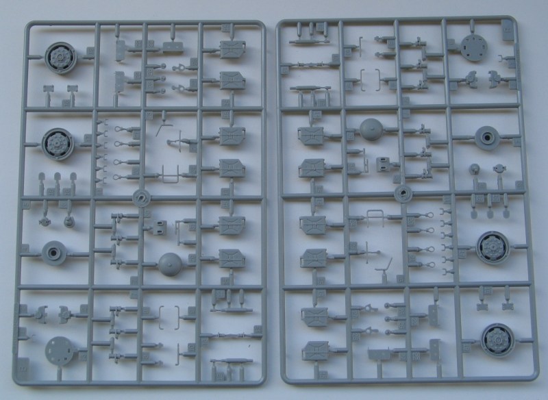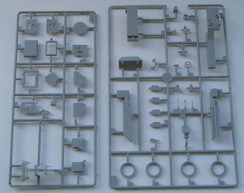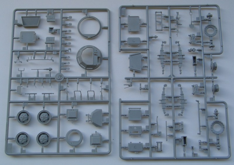 Alle Luken und Türen können geöffnet werden. Das Fahrwerk ist ausreichend Detailliert. Die Reifen sind aus sehr weichem Gummimaterial gefertigt. Da in diesen heut zutage kein Weichmacher mehr verarbeitet wird, dürfte in Verbindung mit den bemalten Felgen, keine Probleme mehr auftreten. Für den Turm und der Wanne liegen die Winkelspiegel liegen als Klarsichtmaterial bei. Auch Scheinwerfer und Blinker sind aus diesem Material. Die Schutzgitter für die Scheinwerfer liegen als Ätzteil bei.