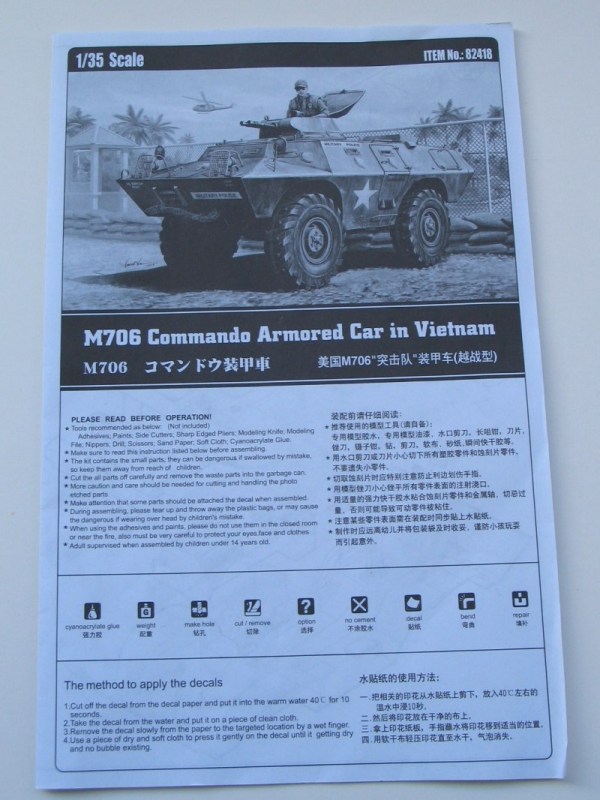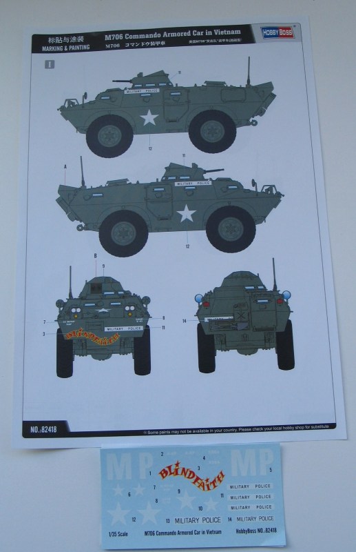 Die Faltbauanleitung ist gut bebildert und erklärt in 12 Bauabschnitten den Bau des Modells. Hier dürften keine Probleme auftreten. Wie bei HOBBY BOSS üblich liegt den Bausatz farbiges zweiseitiges Blatt mit Bemalnungs- und Markierungshinweisen bei. Der Decalbogen ermöglicht den Bau von zwei Fahrzeugen der US Militär Polizei Vietnam. Die Qualität der Decals ist in Ordnung. Der Trägerfilm ist etwas kräftig geraten und die Decals sind Hochglänzend. Aber das dürfte ja kein Problem sein.