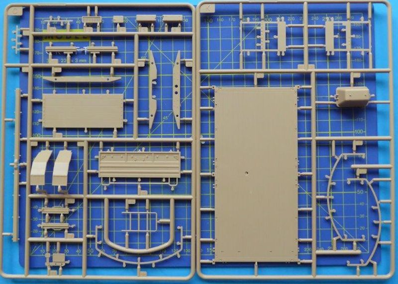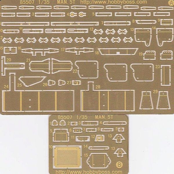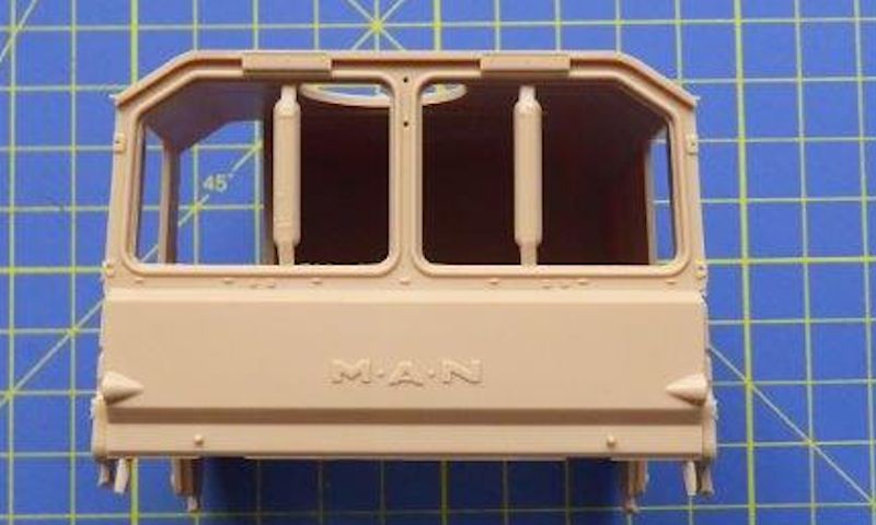 Bausatz: Dem Revellbausatz des MAN Fünftonners von 2001, dem man auch schon sein Alter ansieht, schiebt jetzt Hobby Boss einen komplett neuen und umfangreicheren Bausatz nach. Öffnet man den stabilen Stülpkarton mit attraktivem Deckelbild des Fahrzeuges, findet man 13 beigefarbene Spritzlinge, eine separate Führerhauskabine, ein Gussast aus Klarsichtmaterial mit Scheinwerfern, Blinkern und den großen Frontscheiben und den Scheiben für die Türen. Dafür gibt es einen Maskensatz für innen und außen! Diese sind vorgestanzt und sollten sich leicht Verarbeiten lassen. So kann man sich das etwas mühsame Abkleben mit Abdeckband oder Maskol sparen. Die Auswerfermarkierungen sind auf den Rückseiten der Bauteile und so nach Bau des Modells nicht mehr sichtbar. Die Spritzlinge sind in Klarsichfolie verpackt. Um einen Gussast mit besonders filigranen Bauteilen ist zusätzlich Polsterfolie gewickelt.