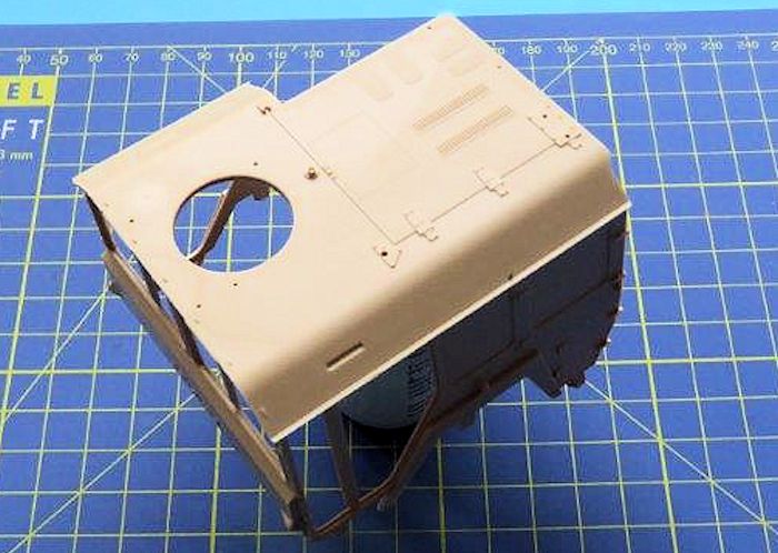 Dem Bausatz liegen zwei Ätzteilplatinnen bei. Mit diesen sinnvollen Ätzteilen können z.B. die Gitterumrandung der Turmkörbe detaillierter dargestellt werden. Viele andere Hersteller von Modellbausätzen gegen ihren Panzerfahrzeugen zur Darstellung der Stahlabschleppseile ein Stück Schnur bei. HB geht hier einen anderen Weg und benutzt gedrehte Kupferlitze. Die nachgebildete Gitterpanzerung ist sehr gut wiedergegeben worden. Dünneres Material wird formtechnisch hier nicht mehr möglich sein.