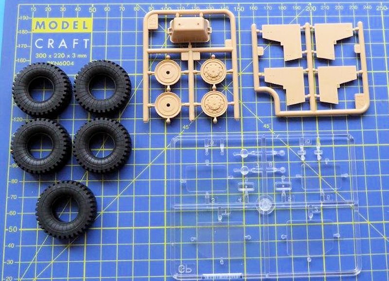 Zwei sinnvolle Ätzteilplatinen steigern die Detaillierung noch. Fünf hochdetaillierte Reifen aus Gummimaterial, leider ohne Schriftzug des Herstellers, liegen bei. Gab es hier Lizenzprobleme?