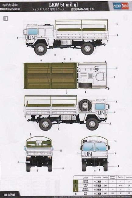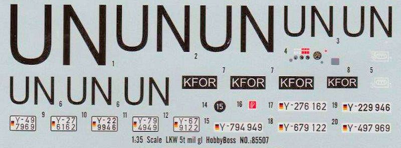 Bemalungsvarianten: Farbangaben finden sich auf einem doppelseitigen farbigen Painting & Marking Guide. Der Decalbogen erlaubt die Markierung zweier Fahrzeuge. Diese werden jeweils in einer fünf Seiten Ansicht gezeigt. Ein KFOR Fahrzeug im drei farbigen Nato Standard Anstrich und ein Fahrzeug in Weiß mit UN Markierungen. Auf Verbandszugehörig geht Hobby Boss leider nicht ein.