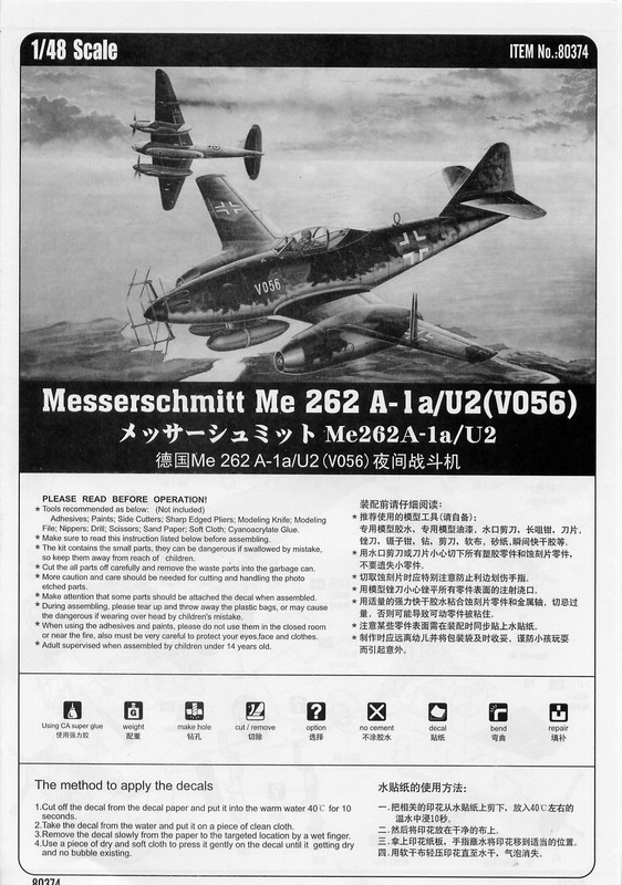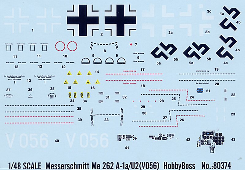 Decals und Bemalunghinweise: Mit den Decals des Bausatzes kann nur der Prototyp V 056 wiedergegeben werden. Die Decals sind in Hochglanz gedruckt. Der Trägerfilm ist kaum sichtbar. Für die Bemalungshinweise legt Hobby Boss das bekannte farbbedruckte Extrablatt bei. Hobby Boss bezieht sich bei der Bemalung des Modells auf fünf Farbenhersteller: Mr. Hobby, Vallejo, Modell Master, Tamiya und Humbrol. Der Rumpf wird mit RLM 74 Grau Grün, RLM 70 Schwarzgrün, RLM 75 Grau Violet und RLM Hell Blau lackiert.