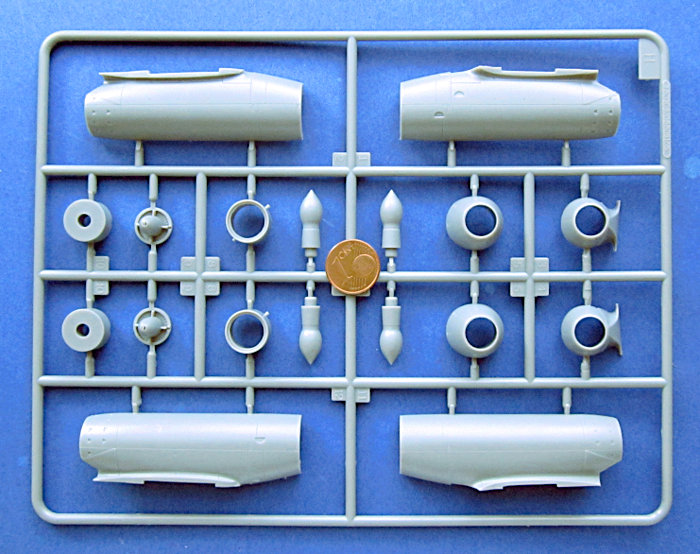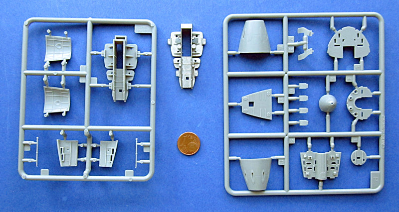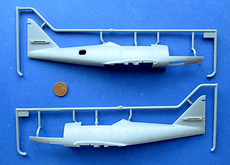 Im ersten Anschein erinnert das Modell an die Tamiyaform, wobei mir von einem befreundeten Modellbauer versichert worden ist, dass das Modell eher vom 1/32er Trumpeterkit abstammt. Hier ist auch die Kabinenhaube wesentlich besser getroffen als von Japans Premiummarke. Die einzige seltsame Formgebung betrifft den Rumpf vor und hinter dem Fahrwerksschacht. Nicht nur nach meiner Meinung sollte der Rumpf hier eher flach und nicht so stark konkav sein. Dies ist aber schwer auf den Vorbildfotos zu erkennen und auch am Modell werden die Triebwerksgondeln meist den Blick verwehren.