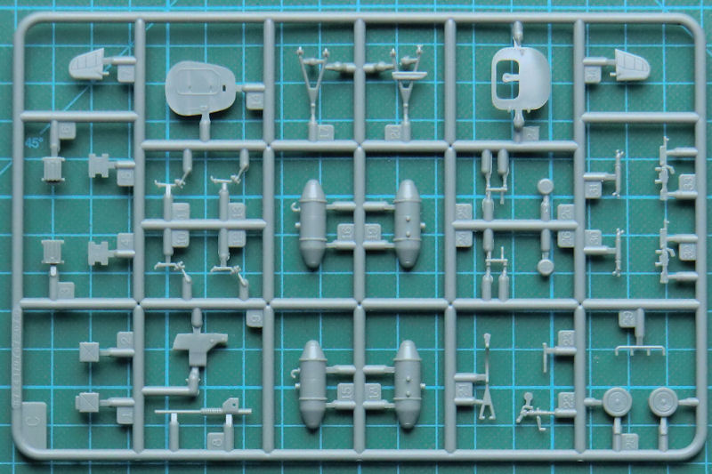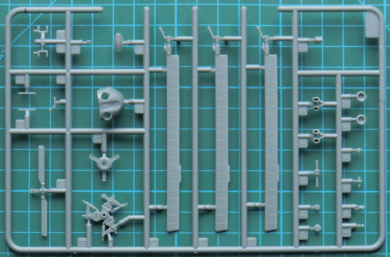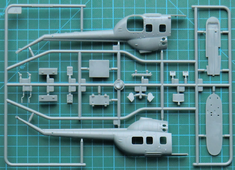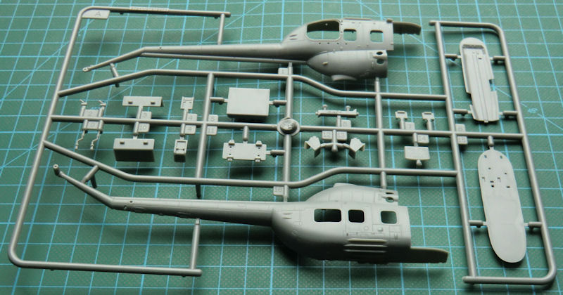 Die Bauteile besitze feine Strukturen und innen gibt es eine Grundausstattung, die für die meisten Ansprüche ausreichend ist. Vor dem Verkleben der Rumpfhälften sollte man ein Gegengewicht einbauen. Als Option kann eine Seitentür offen montiert werden. Das Fahrwerk ist ordentlich detailliert. Gleiches gilt auch für den Haupt- und Ausgleichsrotor.