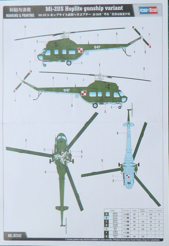 Schön ist die mehrfarbige Bemalungsanleitung für ein nicht weiter beschriebenen polnischen Miltärhubschrauber. Die Farbangaben beziehen sich auf die Systeme von Mr.Hobby, Valejo, ModelMaster, Tamiya und Humbrol.