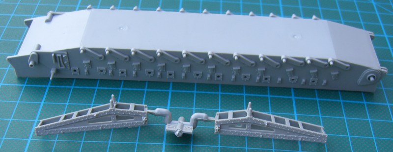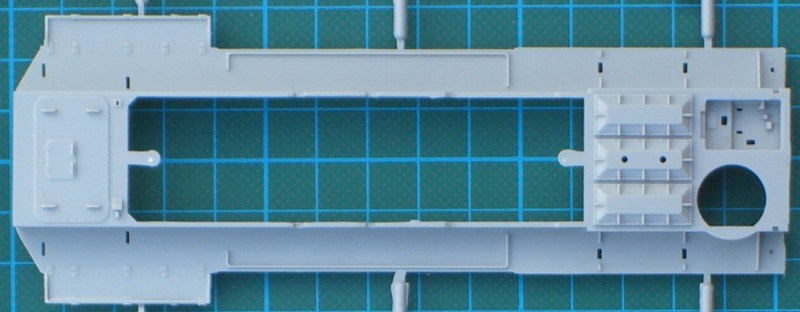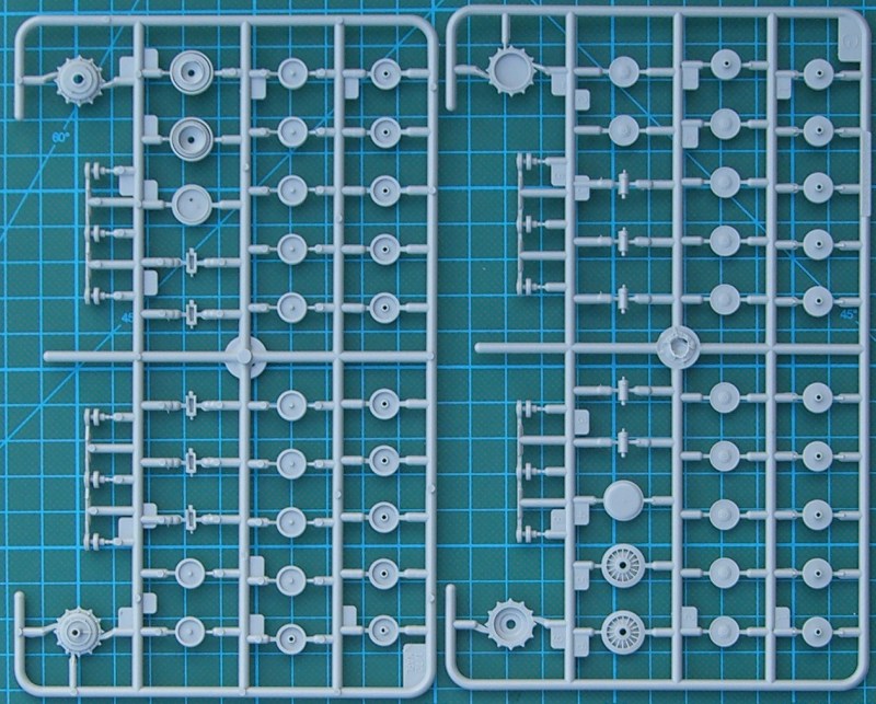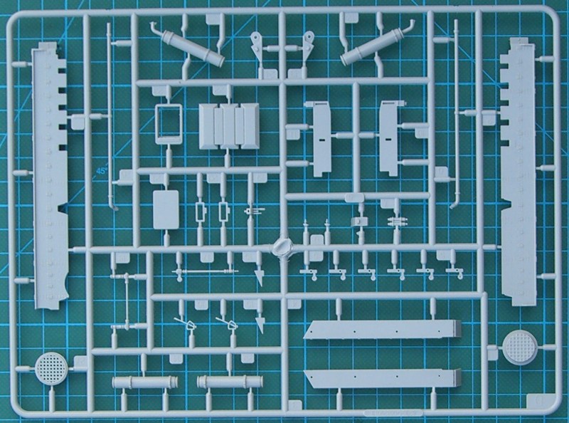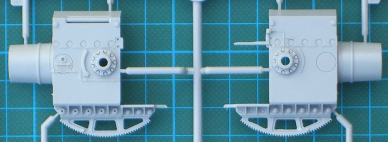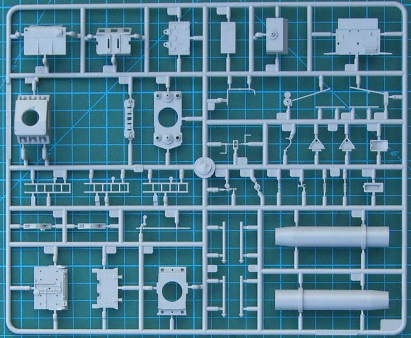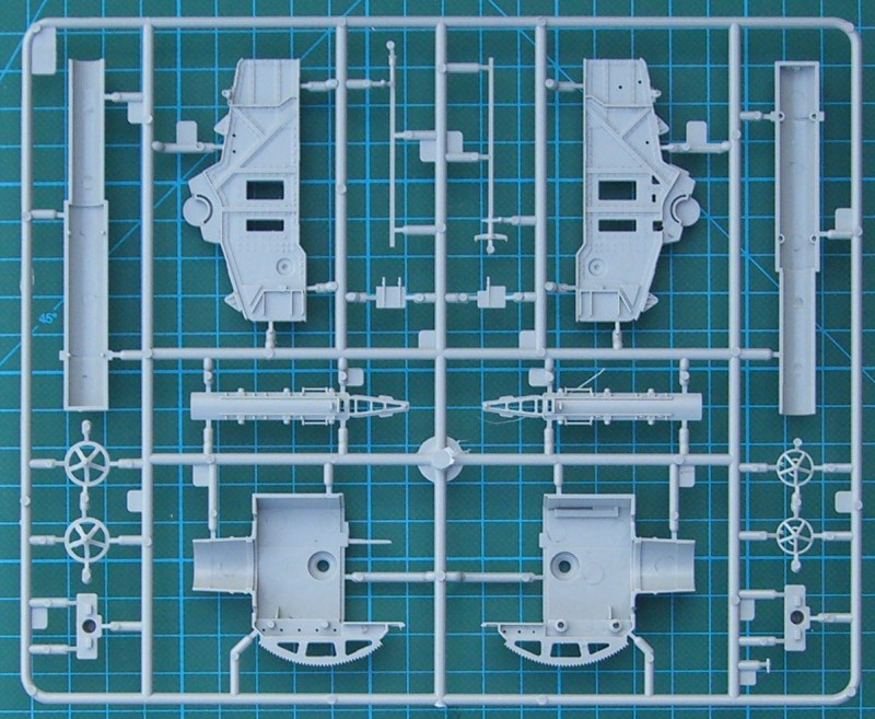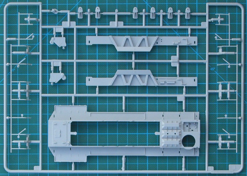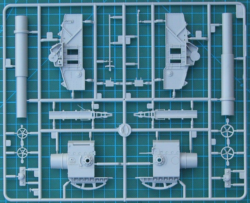 Eines fällt allerdings sofort auf. Bedingt durch die Konstruktion der Schwingarme an das Gehäuse kann der Mörser nur in Transport und nicht in der Feuerstellung gebaut werden. Schade, dass da das Deckelbild was anderes suggeriert. Vielleicht kann ja HOBBY BOSS noch mal nachlegen. Die Bauteile sind sehr fein und die gesamte Konstruktion sieht sehr durchdacht aus. Wer noch keine Erfahrungen mit den Gummiketten hat, dem sei gesagt, dass sie sich nicht mit normalem Kunststoffkleber verbinden lassen. Sie sind aber sehr schön detailliert und das zählt zu den Stärken der Gummiketten. Gut gefallen auch die beiden Rohre. Sie besitzen im vorderen Bereich angedeutete Züge!