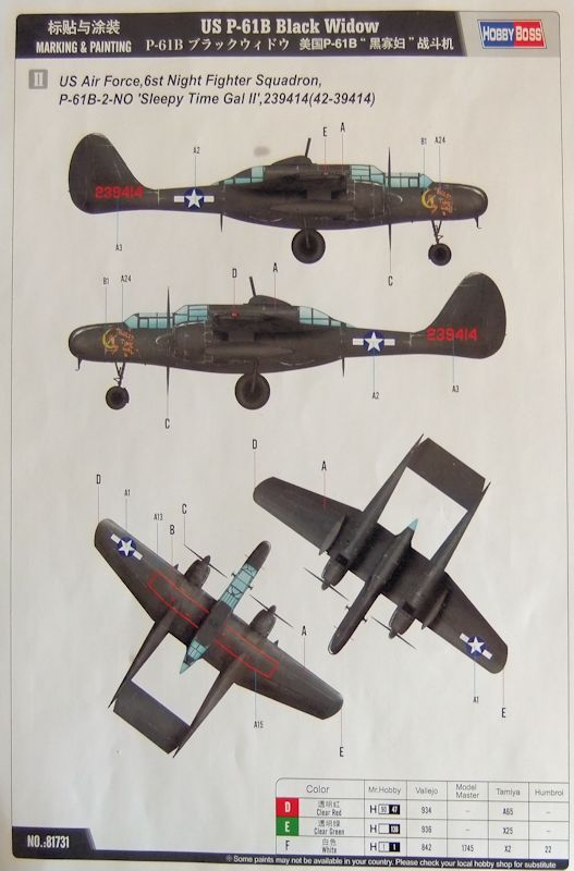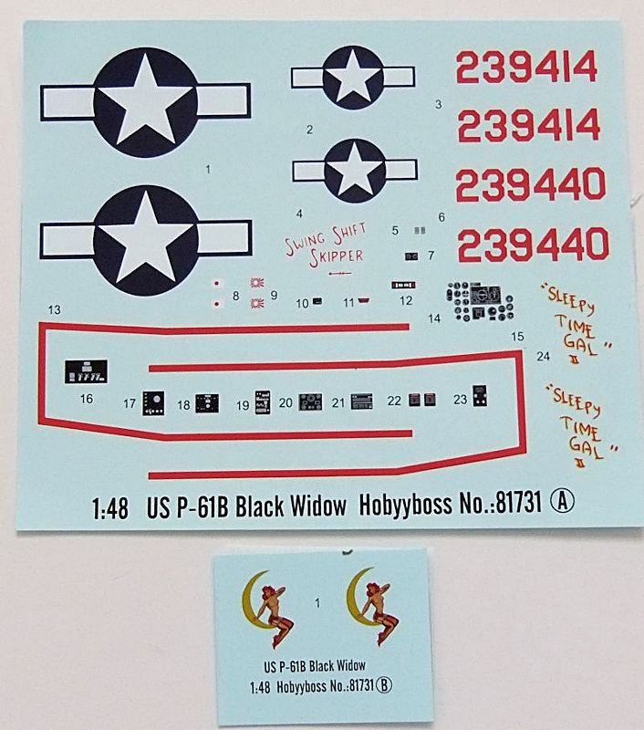 Die "Sleepy Time Gal II" sowie die "Swing Shift Skipper" waren P-61 B-2 Maschinen. Das heißt, beide flogen ohne den Rückenturm. Das Kartonbild zeigt übrigens die zweite Version in der historisch korrekten Ausführung. So muss für den Rumpfrücken eine runde Abdeckung gefertigt werden. Im Bausatz ist solch ein Teil nicht enthalten. Oder man besorgt sich andere passende Decals. Auch hatten beide Maschinen im Original keine Unterflügelstationen. Solche Versäumnisse sind schade.