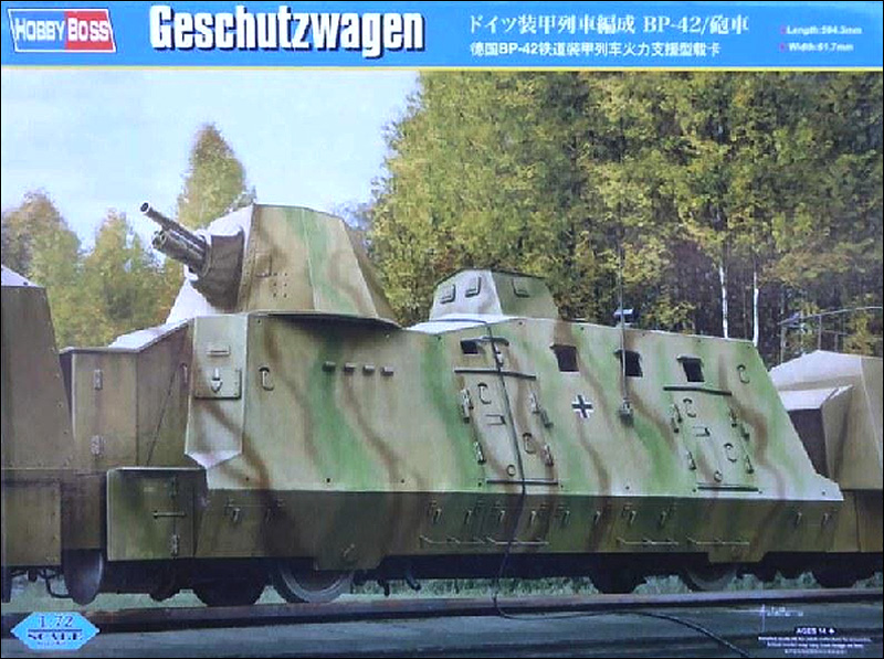 Bausatz: HobbyBoss hat als ersten Wagen seines Panzerzuges BP 42 bzw. 44 den Geschützwagen herausgebracht. Geliefert wird ein Fahrzeug mit symmetrischem Aufbau, alle (??) neuentwickelten Wagentypen eines BP 42 sollen aber einen deutlich asymmetrischen Aufbau besessen haben, erst die Waggons des BP 44 bekamen symmetrische Aufbauten auf den zweiachsigen Fahrgestellen des Gattungbezirks "Linz". Zuordbare Fotos sind aber ein großes Problem bei den Standardpanzerzügen, da beschädigte oder zerstörte Waggons oft bunt ausgetauscht wurden.