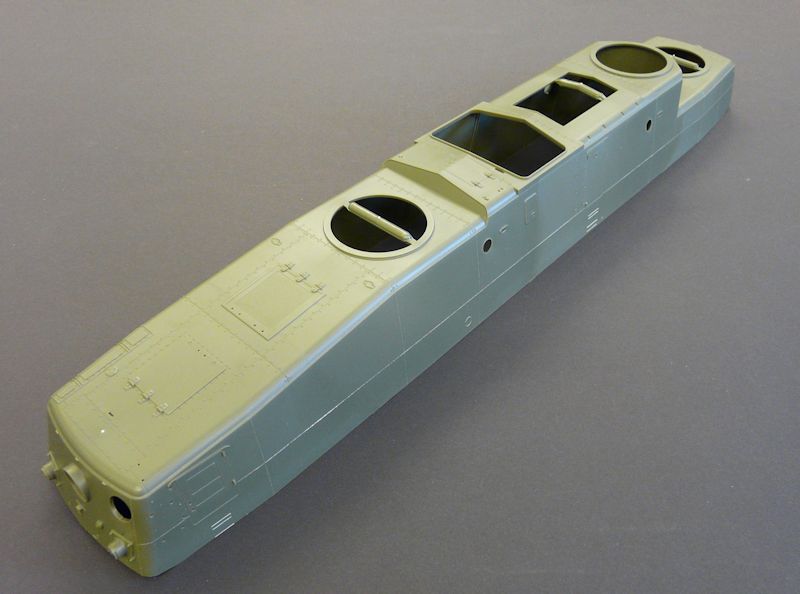 Der Hauptkörper besteht im Grunde aus nur vier Teilen. Einer grossen "Wanne", einem Unterboden und zwei inneren Versteifungswänden. Da man in China scheinbar nicht wusste, wie es im inneren Bereich der Maxim-Vierling-MG-Stellung aussah, gibt hier auch keinerlei Innendetails. Wer hier detaillieren will, hat also "freie Bahn". Sämtliche Einstieg- bzw. Ausblickluken sind geschlossen dargestellt. Hier müsste man also eventuell auch selber ran. Die zentrale Kommandokuppel ist einteilig gespritzt und bekommt noch einen drehbaren Kommando"turm" oben drauf. Puffer und Anhängekupplungen, sowie Fahr- und Bremslichter vervollständigen den generellen Fahrzeugkörper.