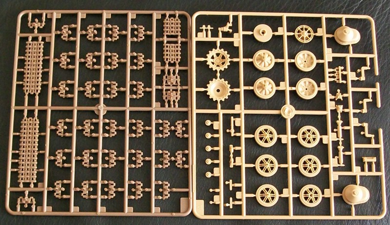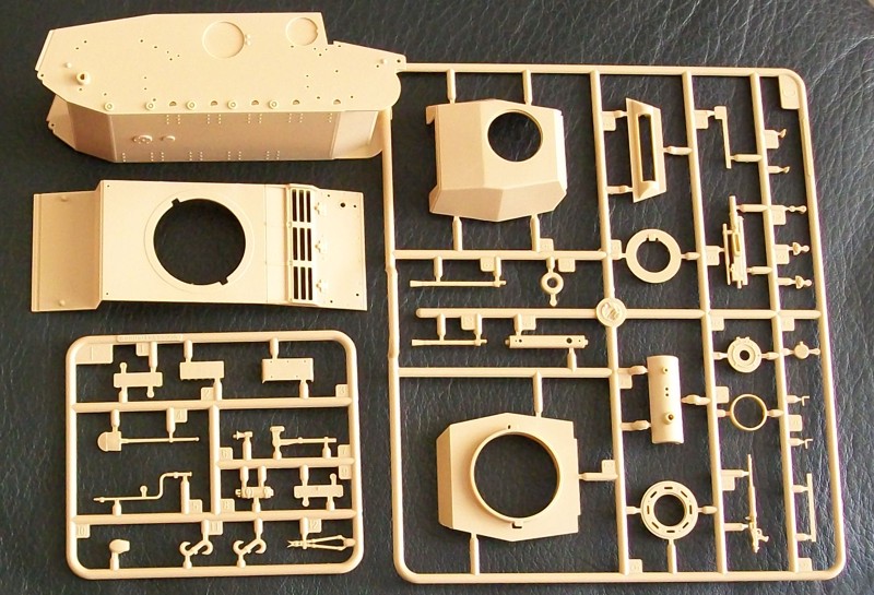 Zum Modell: Der Bausatz besteht aus den gewohnten filigranen Teilen dieses Herstellers. Ebenso liegt neben Klarsichtmaterial für die Sichtblenden des Panzers auch ein kleiner Ätzteilsatz bei. Die Einzelglieder Kette aus Plastik ist bereits obligatorisch.