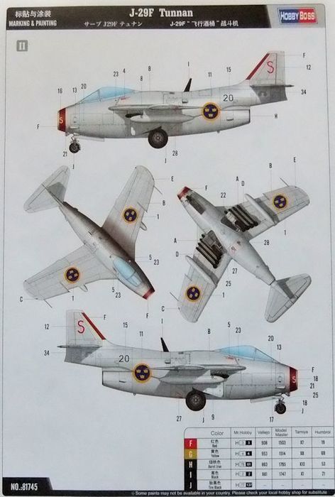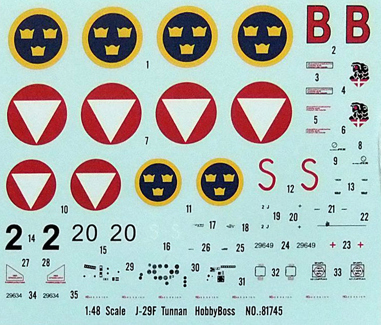 Bemalung: Es kann eine schwedische oder eine J-29F der Österreichischen Bundesluftwaffe gebaut werden. Alle beiden Maschinen sind in Naturaluminium gehalten. Bei dem Schweden gibt es aber noch die Kritik, dass das Blau der Kokarden zu dunkel ist. Aber die "Tunnan" aus Österreich ist sowieso etwas farbenfreudiger.