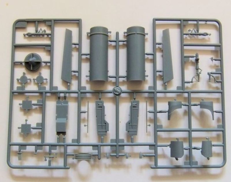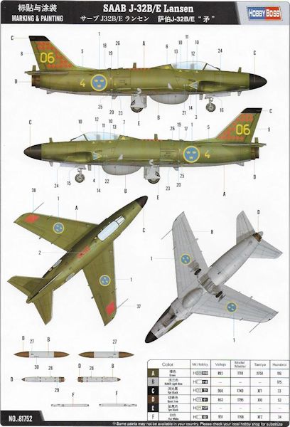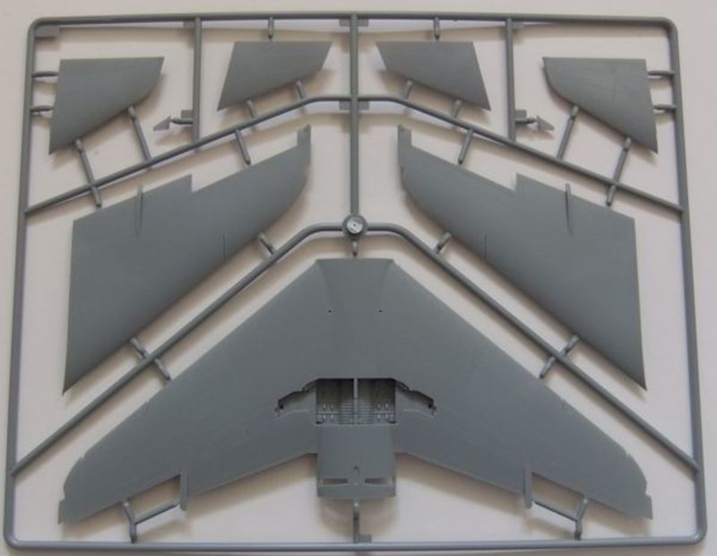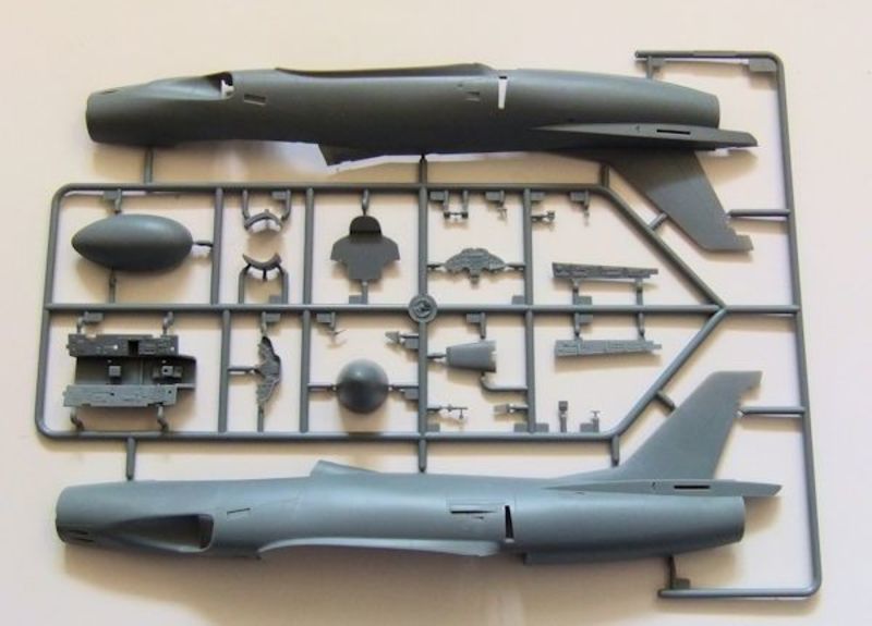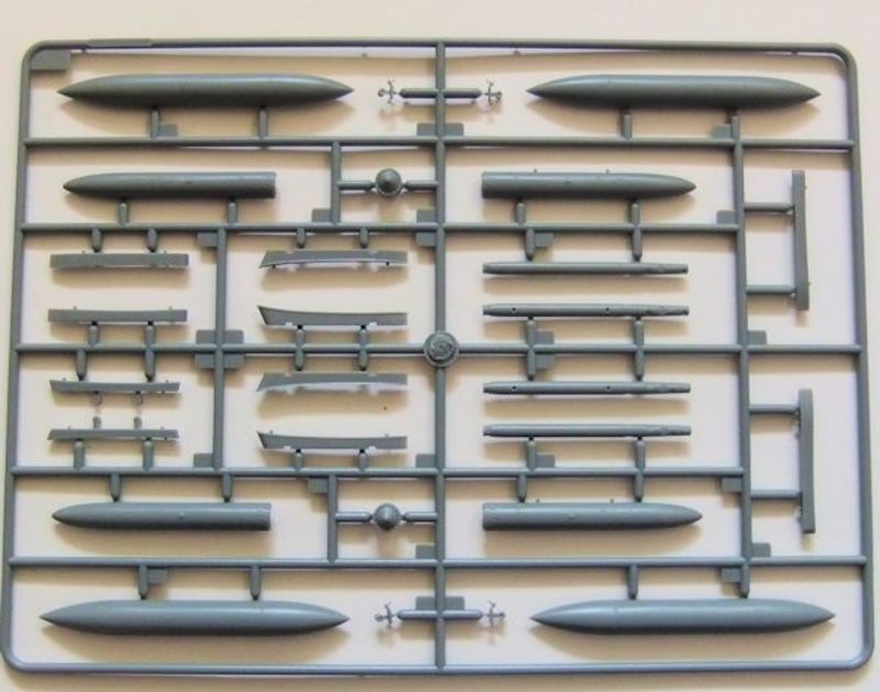 So weit, so gut. Nun geht es aber um die Ausrüstung der Maschine. Hobbyboss schlägt den Jagdbomber Saab J-32 B, sowie das Flugzeug für Störeinsätze J-32 E vor. Für den Störer sind alle erforderlichen Teile für die Bestückung der unteren Tragflächen vorhanden. Von innen nach außen sind dies: Ein Störbehälter, der wie ein Zusatztank aussieht, in seiner Ausführung aber nicht ganz stimmig ist. Ihm fehlen einfach ein paar seitliche Sensoren. Diese können aber einfach nach Recherchen im Internet ergänzt werden. Dann folgt der schmale Aufzeichnungsbehälter und ganz außen hängt der Täuschkörperwerfer (Dispenser). Für den Jagdbomber liegt keine externe Bewaffnung bei. Baut man nun die J-32B unbewaffnet, wie auf Kartondeckel und farbigen Faltblatt abgebildet, ist alles o.k.