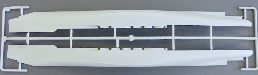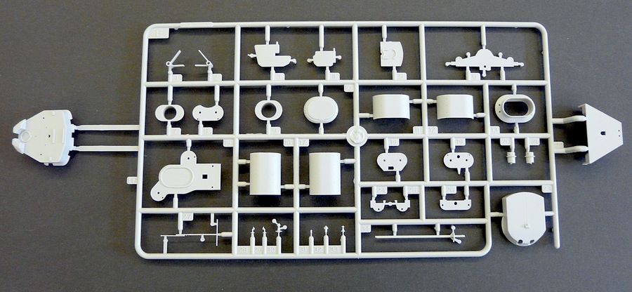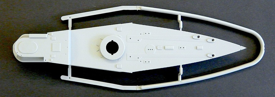 Der Rumpf ist nicht als Voll- oder als auf Höhe der Wasserlinie geteilter Rumpf ausgeführt, sondern wurde klassisch in zwei Hälften, verzugsfrei, gefertigt. Oberflächendetails, wie sie für die Darstellung der "vor-Skagerrak" Konfiguration notwenig wären, wie zum Beispiel die Klappen der 8,8 cm Kasemattgeschütze seitlich am Bug, fehlen leider. Obwohl die hälftige Fertigung des Rumpfes es eigentlich ermöglich hätte, sind die Oberflächen unstrukturiert ausgeführt. Plattengänge sind nicht vorhanden und auch die Dopplerstreifen am Überwasserschiff sucht man vergeblich. Insofern entspricht der Bausatz dem Resin-Vorgänger von Combrig. Dieser weisst allerdings die vier Torpedorohrmündungen auf, von denen uns Hobby Boss leider nur jene unten am Bug gönnen mag! Die externen Wellentunnel sind nicht Teil der Rumpfhälften. Sie werden separat angebaut. Die Wellen und die Wellenböcke der beiden inneren Propeller sind ebenfalls separat gefertigt. Bei den Propellern wurde auf die Gegenläufigkeit geachtet. Stabilität erhält der Rumpf durch fünf Spanntwände, die auch die Decks abstützen. Der Rumpf weist keinerlei Hinweise daraufhin auf, dass Hobby Boss eine "Vor-Skagerrak" Version in petto hat, da auch im Inneren keine Vorbohrungen für die Ablage oder Spieren der Torpedonetze vorgegeben sind. Sollte da was geplant sein, müsste eine Form für frühe Rumpfhälften existieren und daran glaube ich nicht.