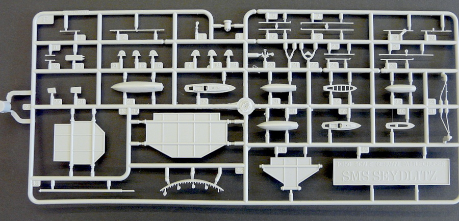 Als erstes fällt auf, dass die Darstellung auf dem Karton nicht dem Inhalt entspricht! Seydlitz wird hier in der "vor-Skagerrak" Konfiguration dargestellt, also mit den Torpedonetzen. Diese sind aber gar nicht enthalten. Das nennt man dann wohl eine "Mogelpackung"!