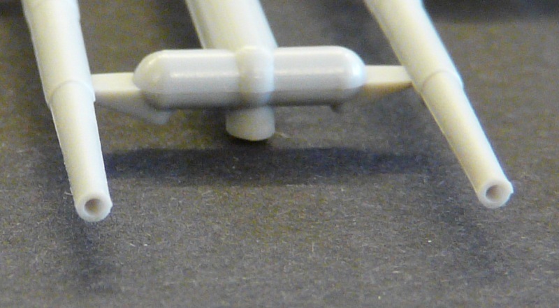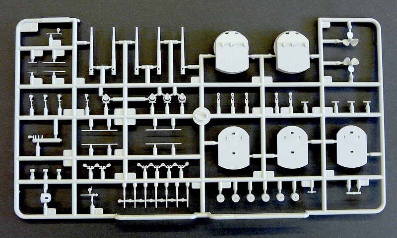 Die Aufbauten sind vielteilig ausgeführt und werden mit einer großen Zahl von Ätzteilen, wie Relings, Niedergängen und Leitern verfeinert. An den Schornsteinen kommen ebenfalls Ätzteile zum Einsatz und zwar für die umlaufenden Stage, was sehr zum positiven Eindruck des Modells beiträgt! Die Lamellen der Lüfteröffnungen an den Aufbauten sind ebenfalls sehr positiv hervorzuheben, da sie ausgesprochen scharfkantig ausgeführt sind. Dahinter befindet sich allerdings, bei fast allen Teilen, nichts! Keinerlei Strukturen wie Lüftergitter etc. Nur wenige Teile bilden da eine Ausnahme. Ein Problem stellt der Unterbau des achteren Mastes dar. Dieser Decksaufbau hatte einen asymmetrischen Grundriss. Das Hobby Boss Bauteil ist leider symmetrisch ausgeführt! Eine Korrektur des Grundrisses ist zwar möglich, aber auch nicht leicht umzusetzen.