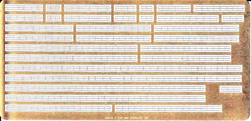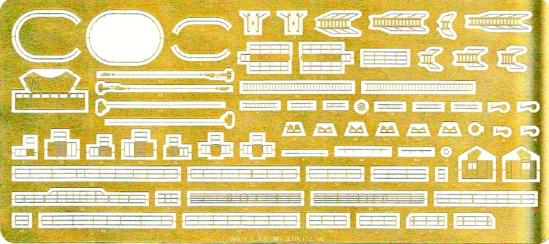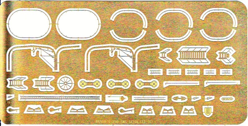 Die 190 Ätzteile sind sehr überzeugend gefertigt. Sogar die Namenstafeln und Wappenschilde wurden berücksichtigt. Das ist deshalb so begrüssenswert, da diese bei Kriegsbeginn eben nicht von Bord der Seydlitz gegeben worden waren. Fotobelege finden sich dafür leicht in diversen Publikation wie zum Beispiel in Gary Staffs Standardwerk "German Battlecruisers of World War One". Seil- bzw. Schlauchhaspeln, Niedergänge, abgelängte Relings, die schon erwähnten Schornsteinstage und noch vieles Nützliches mehr lassen hier kaum Wünsche offen. Die Deckel der Kohleluken wäre noch toll gewesen, aber diese hatte man in China wohl ganz einfach nicht auf dem Schirm und das ist echt ein Problem!