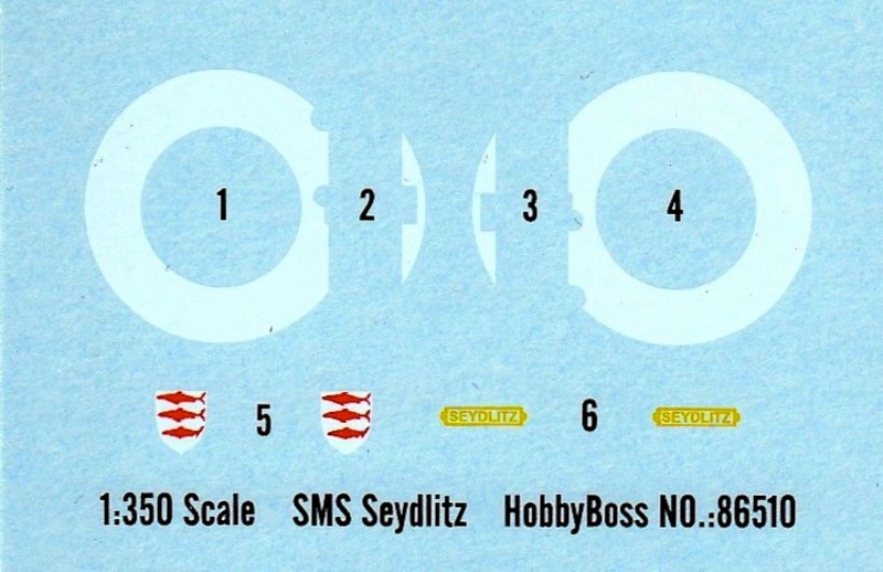 Die Bemalung: Der wie immer farbig gestaltete Bemalplan zeigt die Seydlitz korrekt ohne Wasserpass mit zweifarbigem Überwasserschiff. Dabei verläuft die Trennlinie zwischen dem dunkleren Grau des Rumpfes und dem helleren Grau der Aufbauten auf der des erhöhten Backdecks und zwar komplett bis zu den achtersten Aufbauten durch. Das ist falsch. Auf Fotos kann man sehr gut erkennen, dass kurz nachdem sich das erhöhte Backdeck nach achtern verjüngt, eine senkrechte Trennlinie verläuft, hinter der die Aufbauten ausschliesslich Hellgrau lackiert sind. Die Farbempfehlungen umfassen die Sortimente von Gunze, Vallejo, Model Master, Tamiya und Humbrol, wobei nicht jede Farbe in jedem Sortiment vorhanden ist.