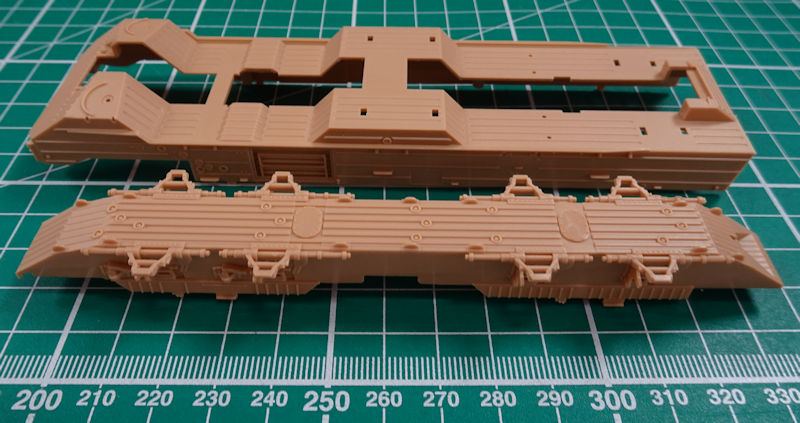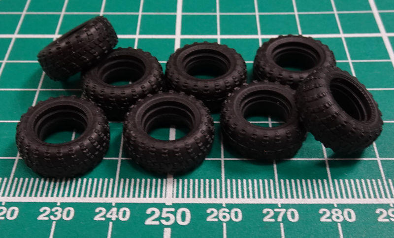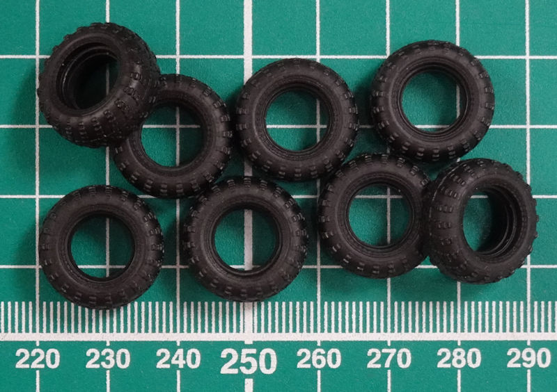 Sehr gelungen ist das Profil der acht Gummireifen. Nicht jeder wird das Material lieben. Die Felgen bestehen aus zwei Hälften. Dafür hat man in China das Fahrwerk samt Fahrzeugunterseite gut wiedergegeben. Die vier Stützen können ausgefahren oder in Transportstellung angeklebt werden.
