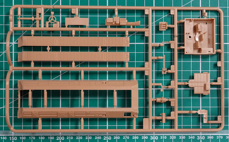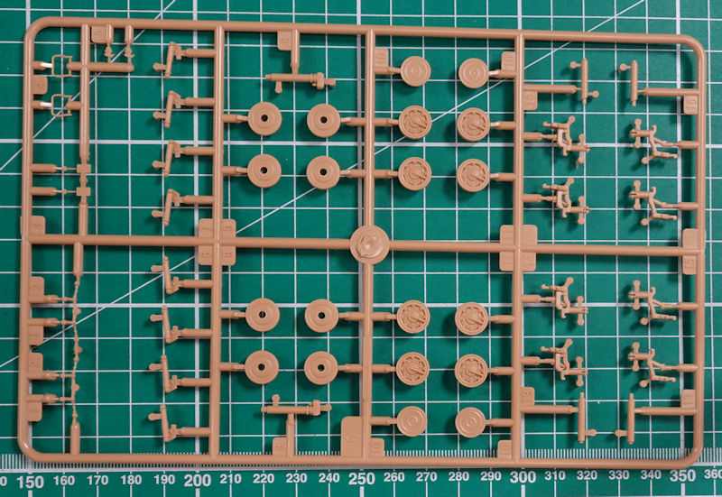 Im stabilen Stülpkarton befinden sich gut verpackt 9 beige Großbauteile oder Spritzgussrahmen, ein Klarsichtrahmen, eine Fotoätzteilplatine, acht Gummireifen, ein kleiner Decalbogen, die mehrfarbige Bemalungsanleitung und die typische Bauanleitung. Insgesamt Die Abspritzung und Qualität der Bauteile ist hervorragend.