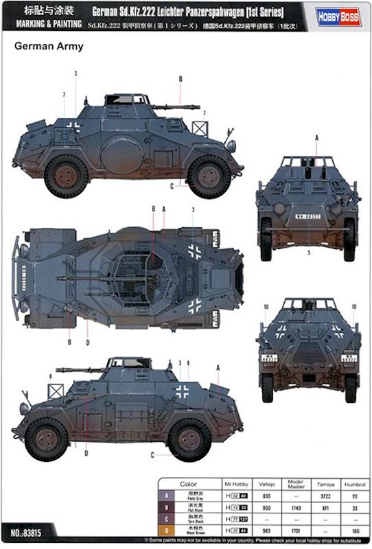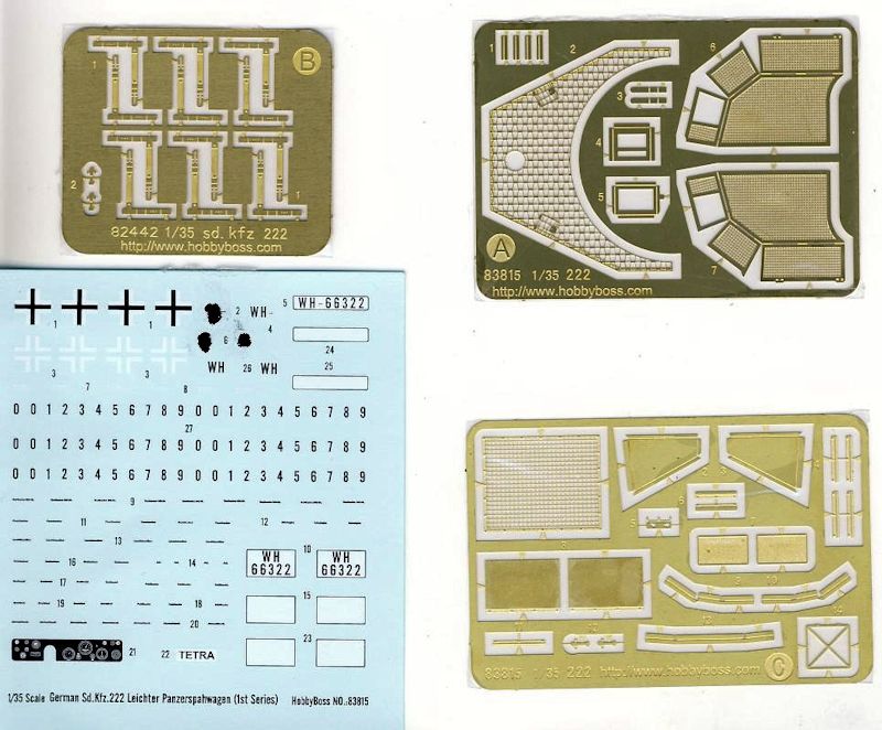Wie immer hat das frühe Sd.Kfz.222 eine komplette Inneneinrichtung (mit Motornachbildung) und die Wahl zwischen der KwK 30/38. Verschieden Bauteile wurden schon bei der Herstellung mit Öffnungen (Flakrohr) oder Vertiefungen versehen. Über die Qualität und Passgenauigkeit der einzelnen Bauteile brauche ich hier nur wenig sagen, eben Hobbyboss! Eine wie immer gut gestaltete 16-seitige Bauanleitung (mit Farbangaben für verschiedene Hersteller) führt sowohl den Anfänger, als auch den fortgeschrittenen Modellbauer sicher zum Erfolg.