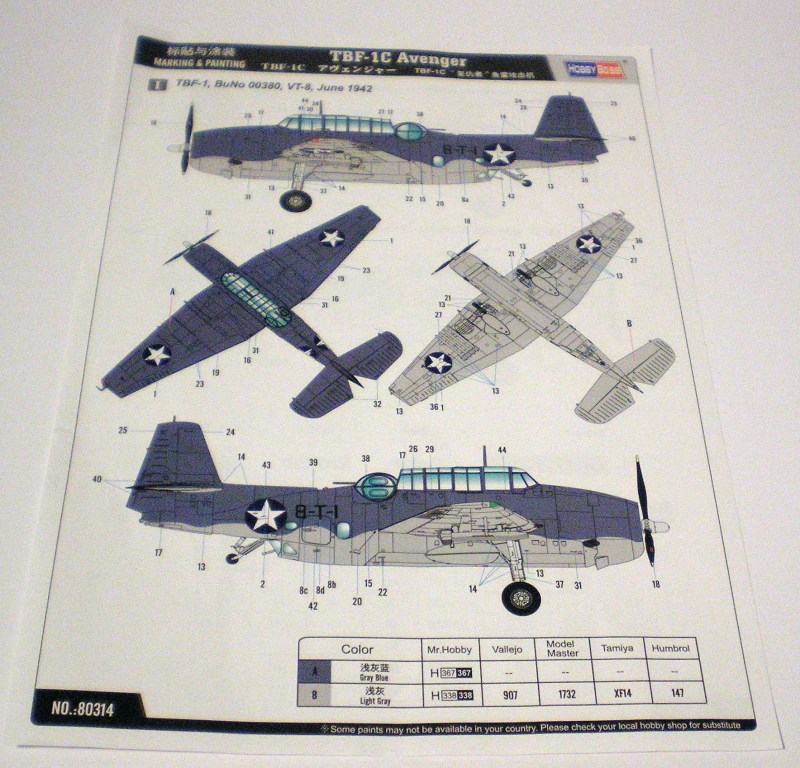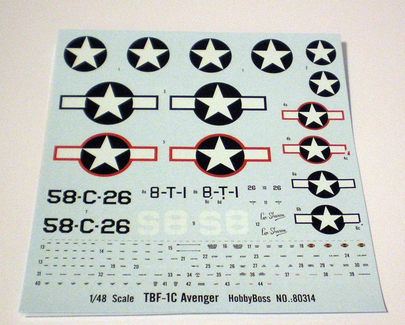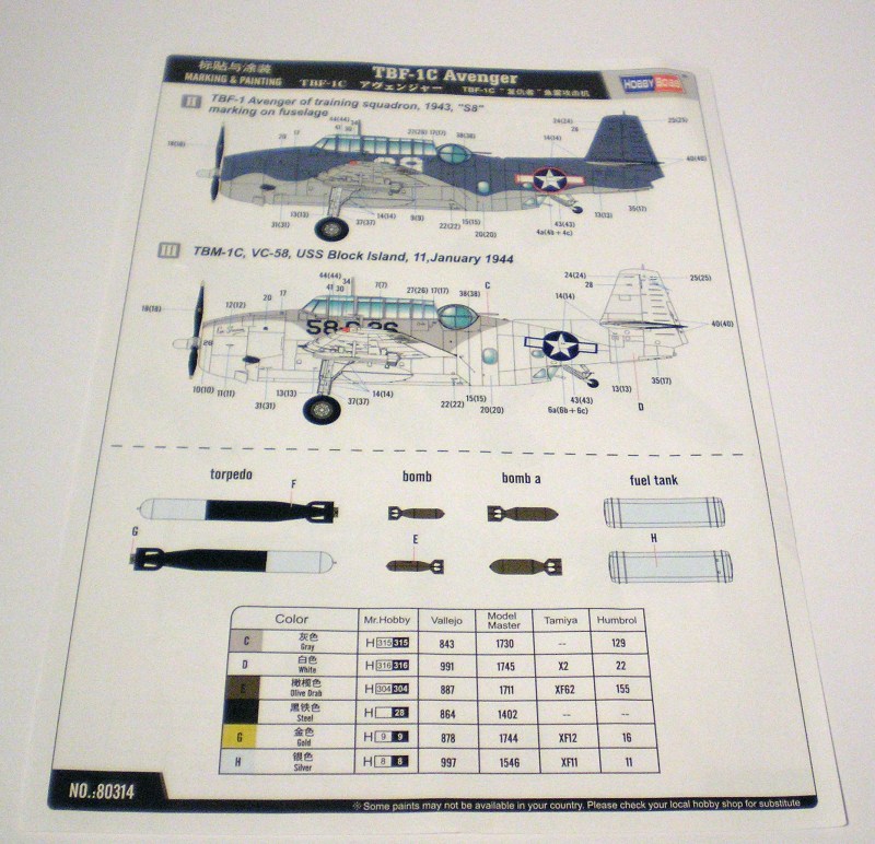 Drei Dekovarianten stehen zur Auswahl: Eine TBF einer amerikanschen Trainingseinheit aus dem Jahre 1943 in Graublau / Hellgrau, Eine Maschine der VT-8 in den selben Farben und TBM-1C der VC-58 / USS Block Island im Atlantianstrich: schmutziges Weiß Neutralgrau.