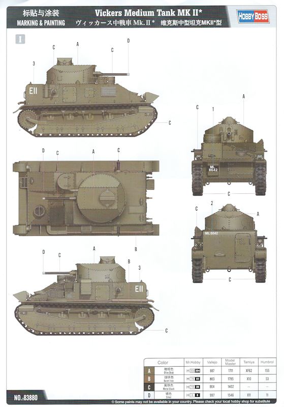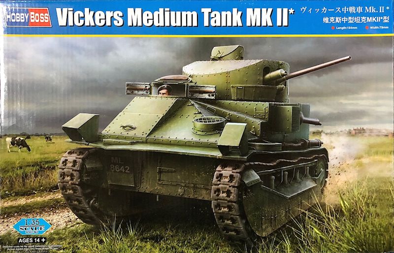 Vorbild: Unter der Bezeichnung Vickers Medium Tank Mark II wurde im Zeitraum zwischen den beiden Weltkriegen beginnend ab 1925 ein mittlerer Panzer von der Firma Vickers auf Basis des Modelles Mk I konzipiert und bis 1934 in einer Stückzahl von knapp 100 gebaut. Verglichen mit der Vorgängerversion erhielt die Ausführung Mk II einen erhöhten Aufbau bei dem auch die Fahrersichtluke von der Stirnseite auf den Frontbereich des Aufbaus versetzt wurde. Ebenso wurde das Kettenlaufwerk überarbeitet und erhielt zudem eine Abdeckung. Bedingt durch die Gewichtszunahme als Folge der Umbauten reduzierte sich die Geschwindigkeit auf knapp 20 km/h. Als Bewaffnung war das Fahrzeug im Turm mit einer 47mm 3 pdr Kanone als Hauptbewaffnung und vier MGs ausgestattet. Zusätzlich waren zwei Vickers MGs auf den beiden Seiten des Chassis eingebaut.