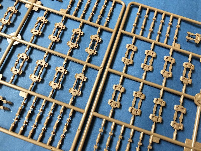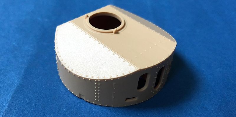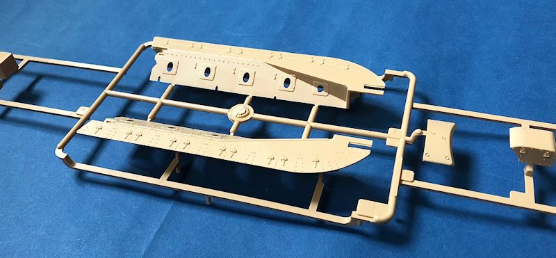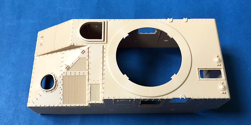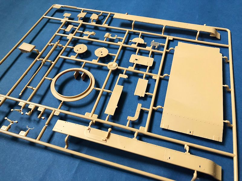 Die beiden größeren Bauteile wie Chassisoberteil und Turmoberteil sind in einem separaten Bereich des Kartons sauber gesichert. Vom Wannenoberteil bin ich absolut begeistert, da dieses in einem Stück ausgeführt ist und trotzdem eine hervorragende Detailgenauigkeit inklusive diverser Nieten und Gitterstrukturen zeigt. Ich gehe von einer mehrteiligen Spritzgussform aus, Das Gleiche gilt auch für das Turmoberteil. Besser geht nicht.