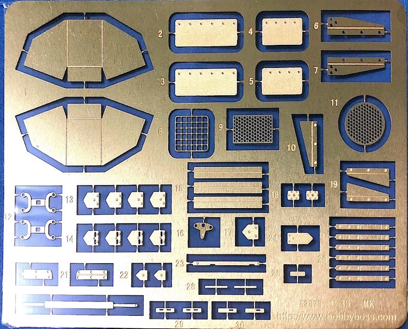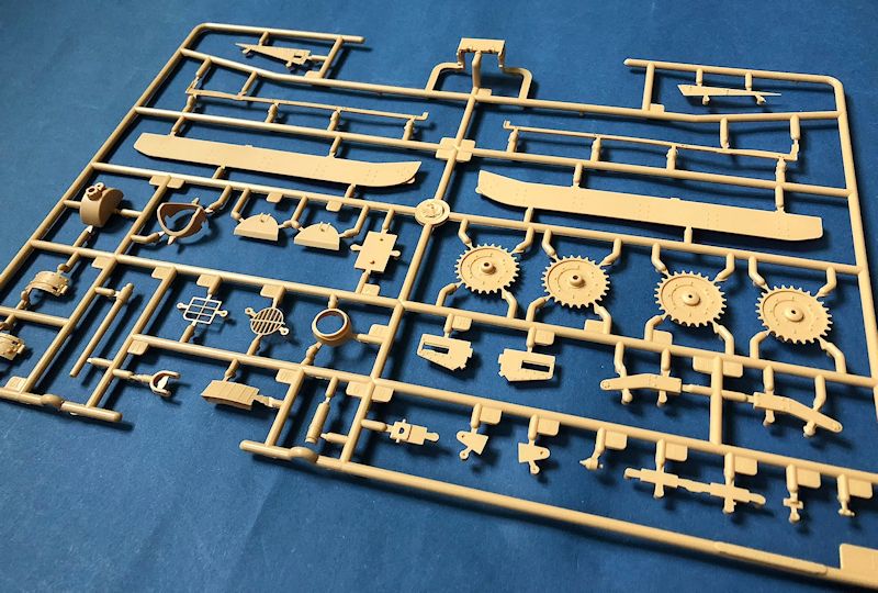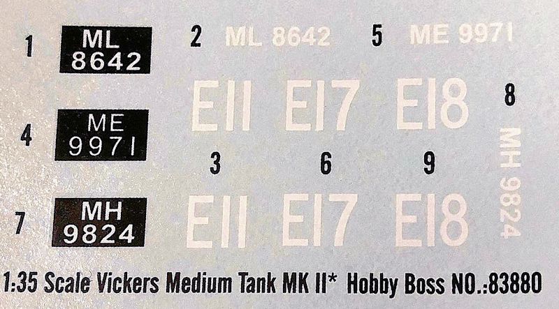 Bausatz: Den Vickers Mk I und Vickers Mk II lässt HobbyBoss konsequenterweise nun auch die Variante Mk II* folgen. In einem sehr stabilen Stülpkarton findet man dreizehn Spritzgussäste in cremegelbem Plastik, zwei separate Bausatzteile für Wanne und Turmoberteil, einen Ätzteilebogen und einen Bogen mit Abziehbildern.