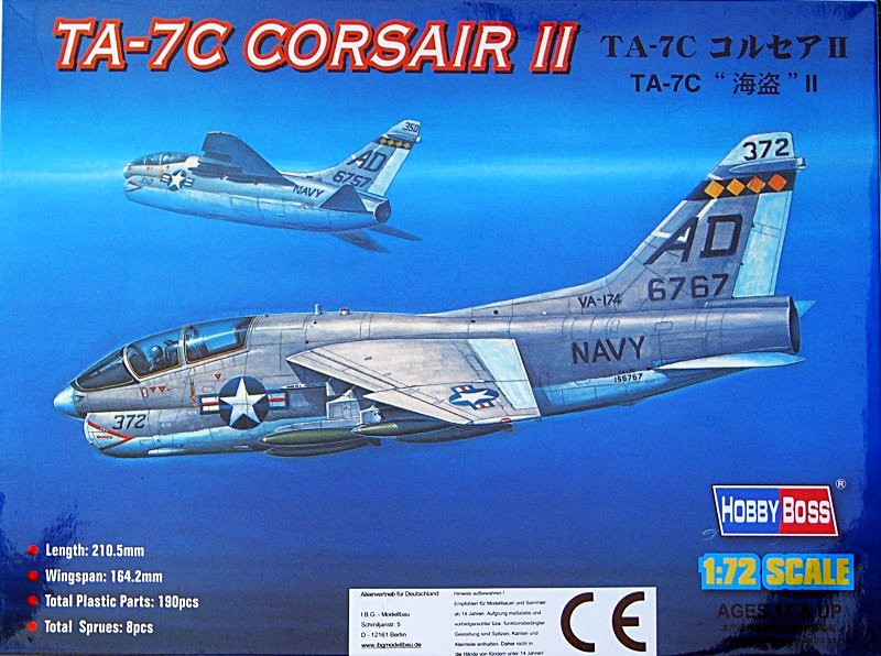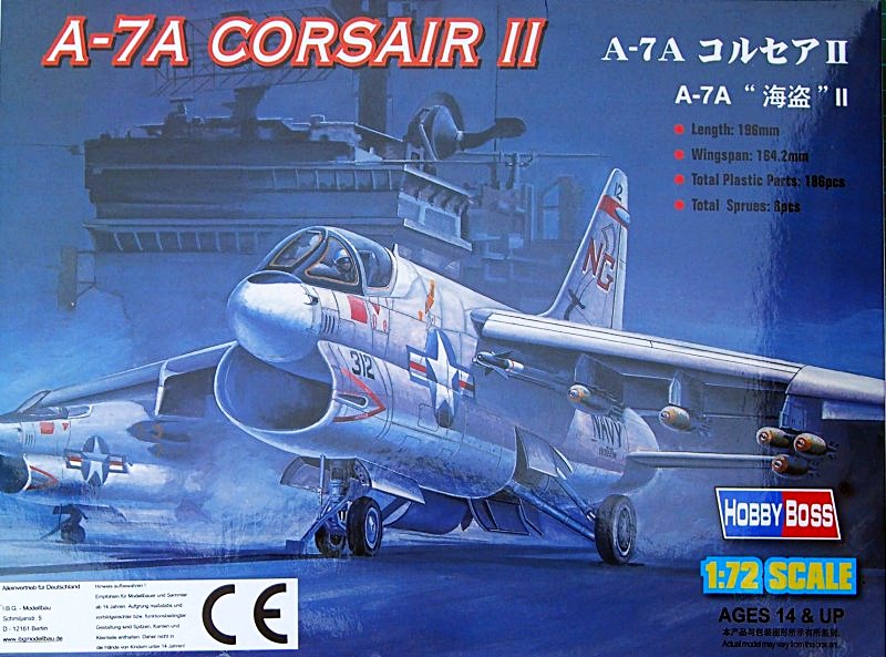Bausatz A-7A, B, C, D und E gab es im Maßstab 1/72 bereits von Revell, Airfix/Heller, Hasegawa und Fujimi, letzterer in recht guter Qualität. Nun hat sich HobbyBoss der ganzen Palette der Corsair II angenommen. und mit der A-7A und TA-7C begonnen.