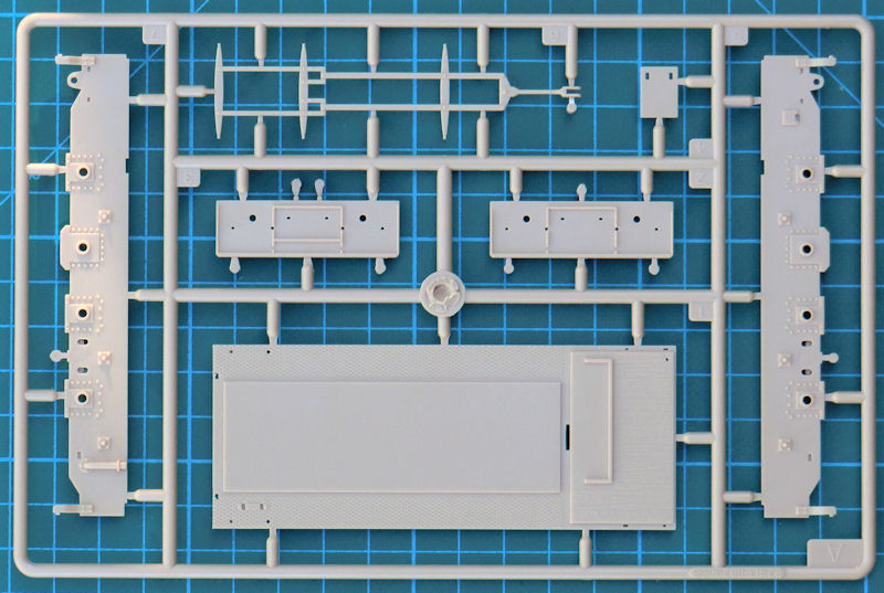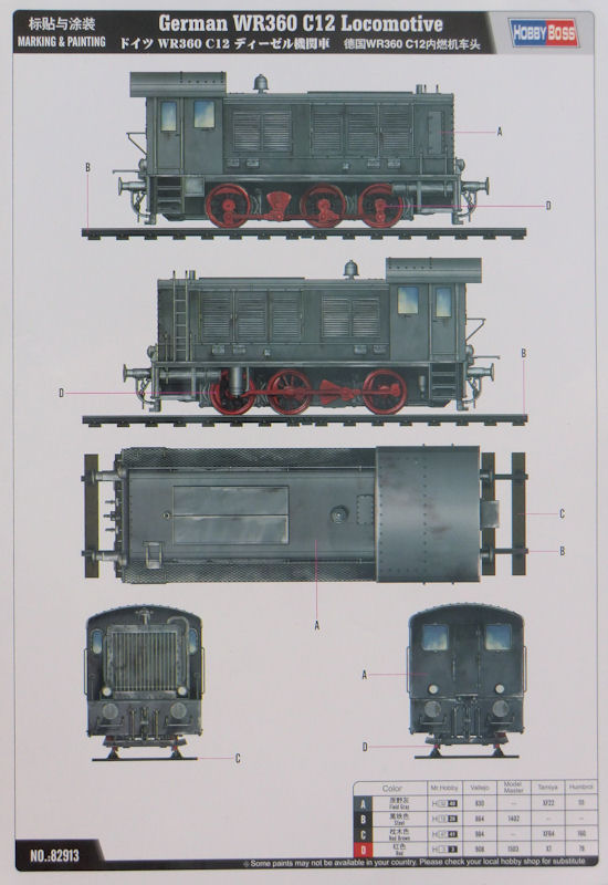 Bausatz: Leider geht es hier um die WR360C12 in 1/72. HobbyBoss hat es, wie zuvor auch Trumpeter in 1/35, eine Vorserienlok herausgesucht und im Modell abgebildet. In dem praktischen Stülpkarton befinden sich gut verpackt sieben ockerfarbende Spritzlinge oder Großbauteile mit insgesamt 121 Teilen, ein Klarsichtrahmen mit sechs Teilen, ein kleiner Decalbogen, die mehrfarbige Bemalungsanleitung und die gute übersichtliche Bauanleitung.