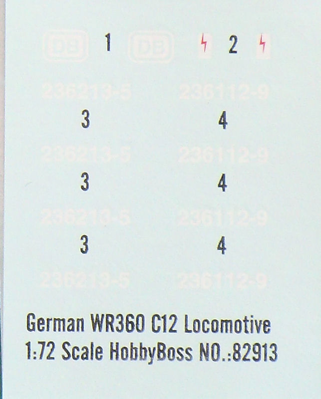 Die mehrfarbige Bemalungsanleitung ist gut gemacht und enthält die Farbvariante der Lieferlackierung. Auf dem Bausatzcover sieht man eine weitere Möglichkeit. Der Decalbogen hilft bei der Kriegslokomotive nicht weiter, den er enthält Markierungen für Lokomotiven der DB!