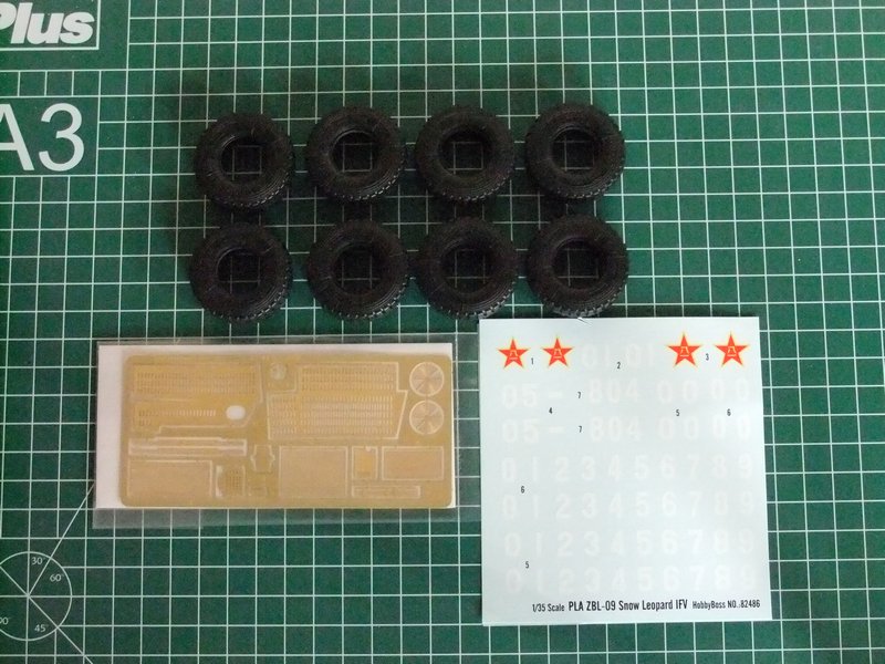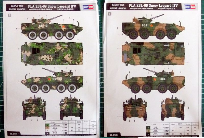 Neben der handlichen und übersichtlichen Bauanleitung liegt dem Bausatz noch ein Farbblatt zur Gestaltung von zwei möglichen Farbvarianten der chinesischen Volksarmee bei. Auf einen kleinen Decalbogen sind die verschiedenen Fahrzeugnummern gedruckt. Eine Herausforderung wäre der Paradeanstrich, wie auf den Kartonbild dargestellt. Neben dem rechteckigen Tarnmuster fallen besonders die Weißwandreifen ins Auge.