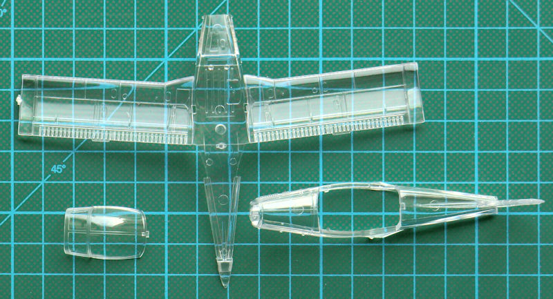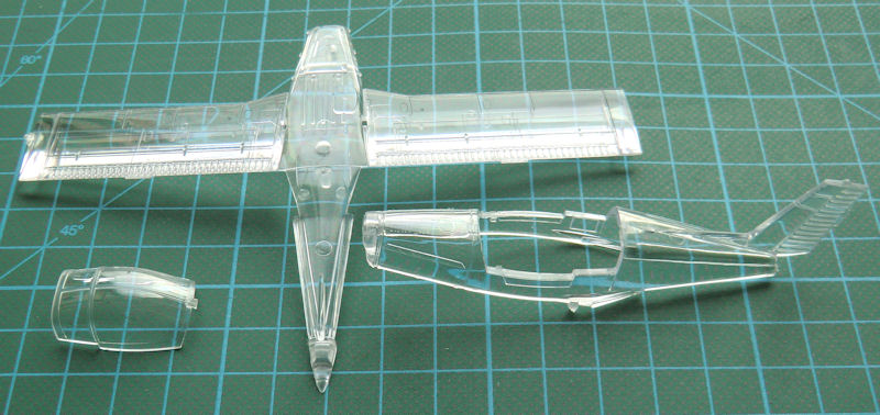 Warum die beiden Großbauteile aus klarem Material hergestellt sind, das wird auch hier wieder ein Geheimnis von HobbyBoss bleiben. Sinn macht es jedenfalls nicht. Einzig der große Scheinwerfer auf an der linken Tragflächenvorderkante kann so leichter dargestellt werden. Man hat in China auch die charakteristische Antenne auf dem Rumpfrücken des Vorbilds nicht vergessen.
