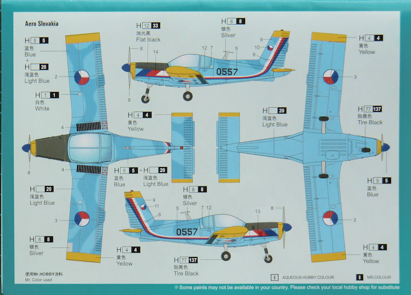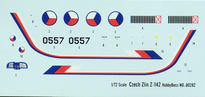 Bausatz: HobbyBoss liefert hier die Zlin Z-142 als Version der Z-42 in der "Easy Assembly Authentic Kit"-Reihe aus. Im stabilen Stülpkarton befinden sich gut verpackt im Blister drei Klarsichtteile(darunter Rumpf und Tragflächen!), ein grauer Spritzgussrahmen mit elf Bauteilen, ein Decalbogen und die Bauanleitung.