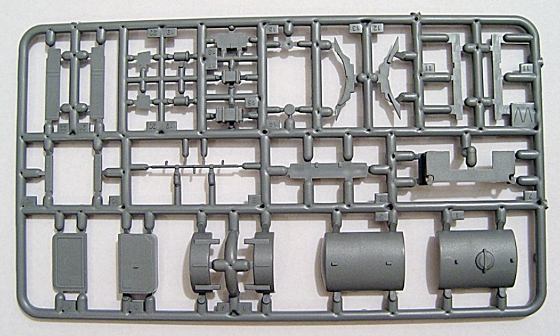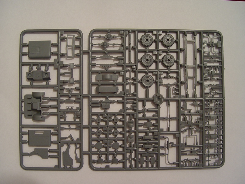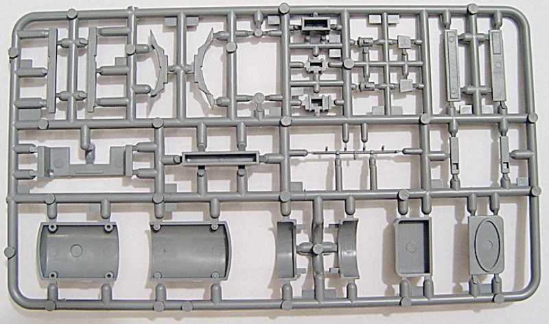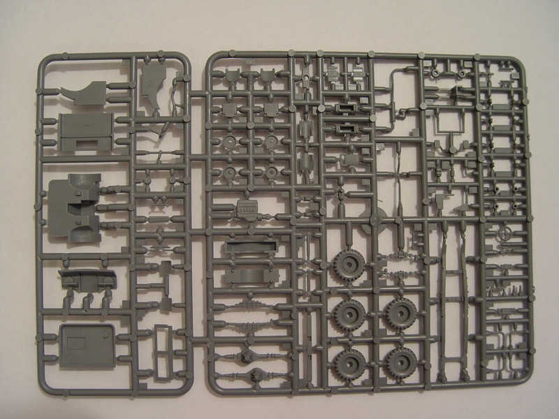 Das Modell Die beiden grauen Spritzrahmen (Grund- und Ergänzungsrahmen) sind überwiegend ohne Grat und gänzlich ohne Sinkstellen produziert worden. Vor allem die Auspuffanlage, die Blattfedern, der Motor und die Reifen sind sehr filigran ausgeführt. Die Stoßstange ist leider etwas zu grob wiedergegeben, da sie im Original aus U-Profilmaterial besteht. Die Form des eigentlich länglichen, d.h. rechteckigen Lüftergrills ist hier zu breit, d.h. quadratisch dargestellt.