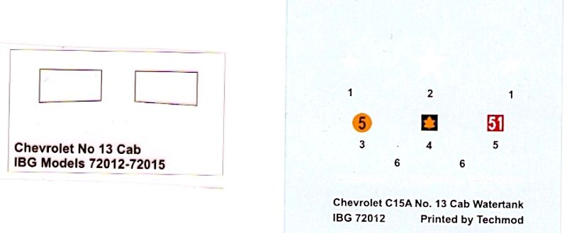 Die Decals ermöglichen die Kennzeichnung für ein Fahrzeug der 2. kanadischen Panzer-Brigade. Eine kleine bedruckte Folie stellt die 2-teilige Windschutzscheibe dar (mögliche Seitenscheiben - siehe Originalfoto im Bericht vom Bausatz 7214 kann man aufwendig selbst gestalten).