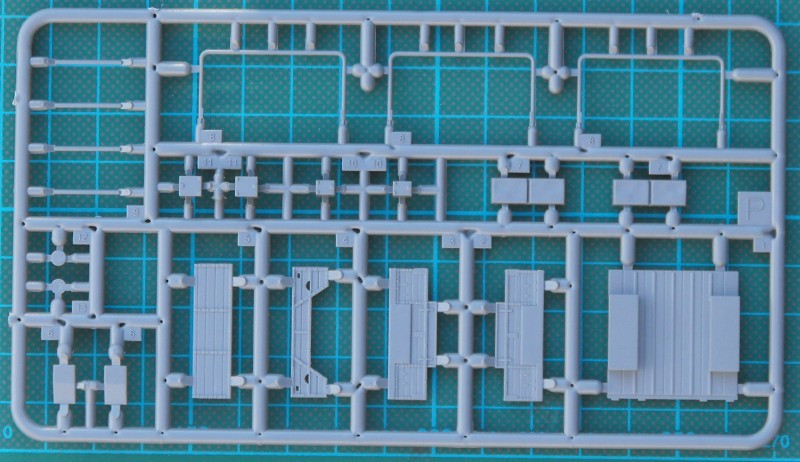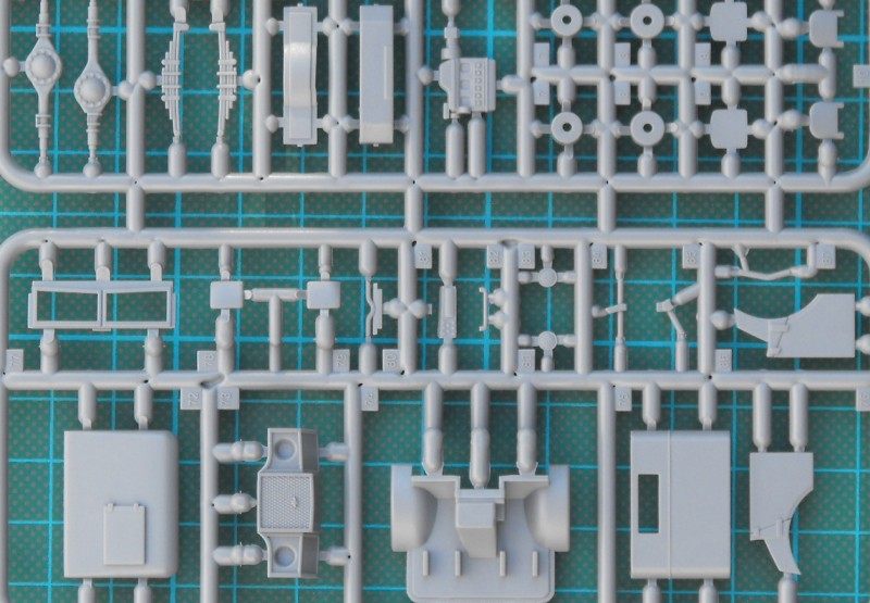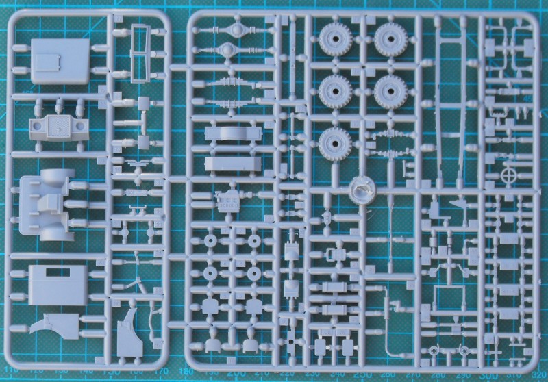 Das Modell Die beiden grauen Spritzlinge (Grund- und Ergänzungsrahmen) sind sauber und ohne Sinkstellen gegossen. Einige Teile erscheinen etwas zu dick (Lenkrad, Außenspiegel, Schalthebel, Schmutzfänger u.ä.). Aber vor allem die Auspuffanlage, die Blattfedern, der Motor und die Reifen sind sehr filigran ausgeführt. Die Stoßstange ist leider etwas zu grob wiedergegeben, da sie im Original aus U-Profilmaterial besteht.