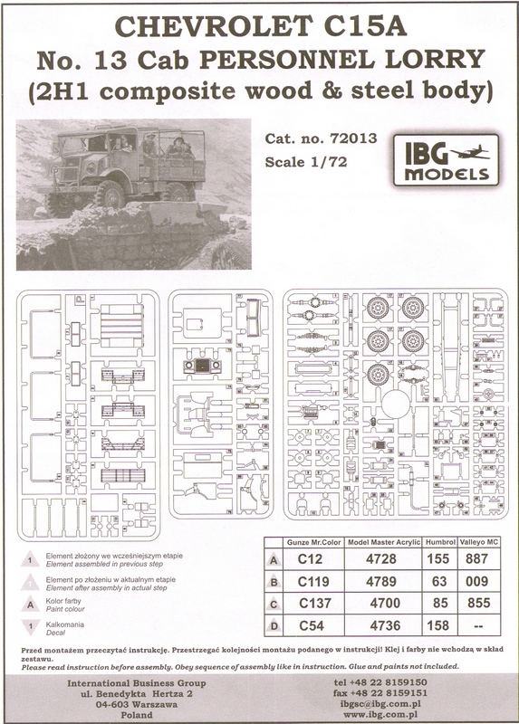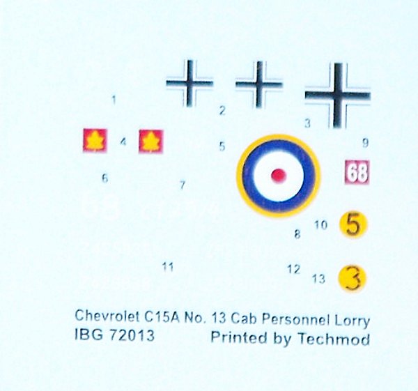 Die Bauanleitung ist übersichtlich und folgerichtig. Bei den sauber gedruckten Decals hat man die Wahl zwischen einem LKW der 1. kanadischen Infanterie-Divisionen, einem polnischen Fahrzeug und einem deutschen Beutefahrzeug. Eine kleine bedruckte Folie erleichtert den Bau der 2-teiligen Windschutzscheibe. Für die mehrteiligen Seitenscheiben an den Türen ist nichts vorgesehen.