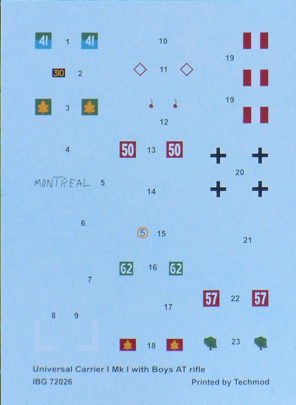 Der Decalbogen ist tadellos im Register auf hellblauem Trägerpapier gedruckt. Die Farbangaben sind für folgende Systeme: Gunze, ModelMaster, Humbrol und Valleyo.