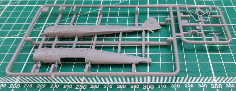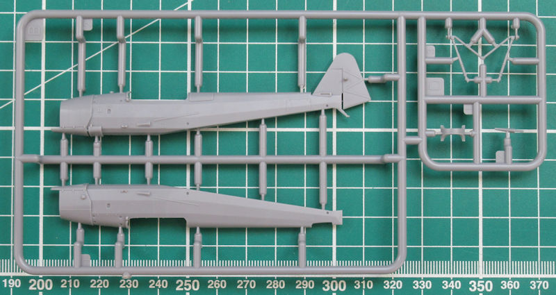 Das Cockpit ist solide für 1/72 detailliert. Hier sollte man auf jeden Fall noch die Sitzgurte ergänzen. Die Bugspitze wird separat angeklebt. Das Seitenruder ist an die linke Rumpfhälfte anmodelliert. Hier gibt es wie bei allen anderen Rudern scharfe Hinterkanten. Eine Fummelei dürfte die Verbindung der Tragfläche mit dem Rumpf werden. Immerhin hat man bei IBG sehr gute Markierungen auf Rumpf und Tragflächen angebracht.