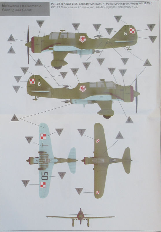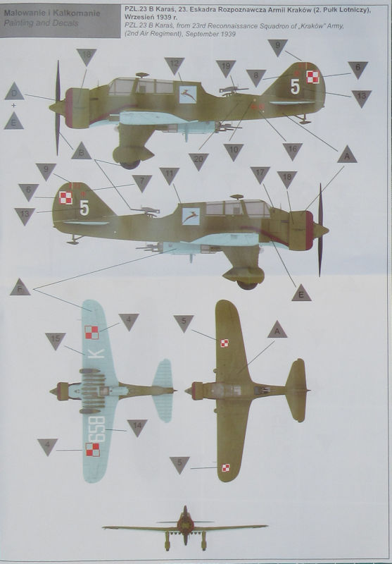 Vorbild: Die PZL. 23 Karas entstand ab 1931 aufgrund einer Anforderung des polnischen Generalstabs als einmotoriger Tiefdecker mit starrem Fahrwerk. Der erste Prototyp PZL. 23/I flog am 01. April 1934. Nach der Erprobung wurde der zweite Prototyp erheblich umkonstruiert. Allerdings stürzte dieser im Juli 1935 ab. Die Flugerprobung musst mit dem dritten Prototypen PZL. 23/III fortgesetzt werden. Danach bestellte das Militär 200 Exemplare der PZL. 23A. Allerding wurden nur 40 Stück dieser Variante gebaut, denn die Flugleistungen waren ungenügend. Daher wurden sie nur zur Schulung eingesetzt.